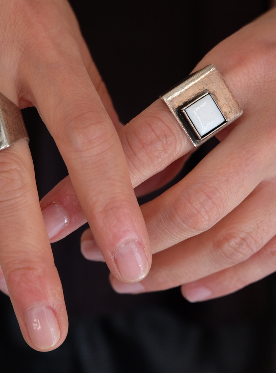 Anello QUADRATO smalto bianco in ottone regolabile con rifinitura in argento anticato con castone quadrato in smalto a fuoco