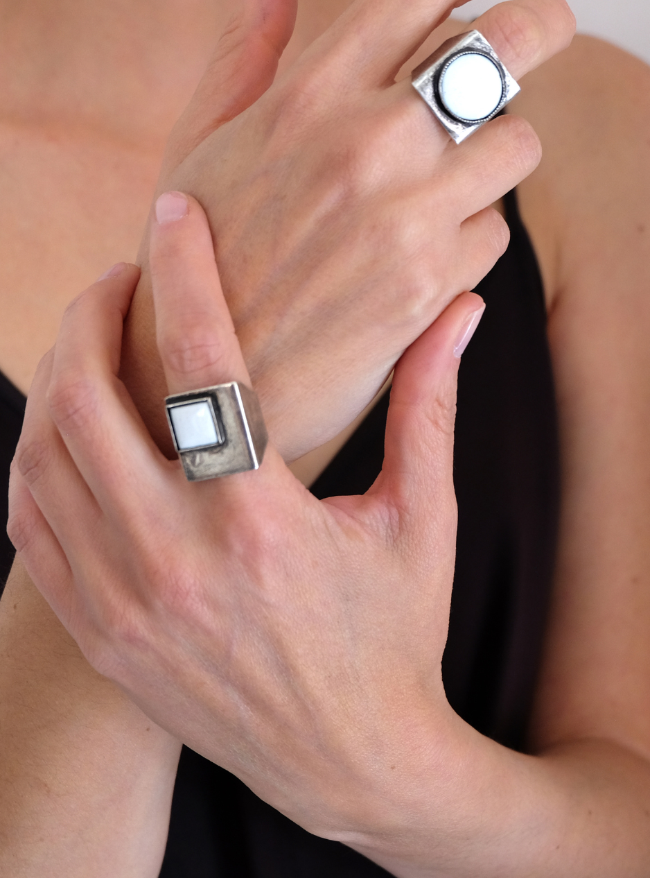 Realizzato in lamina di ottone sottilissima è estremamente leggero e confortevole, con una rifinitura superficiale in argento anticato che dona un effetto opaco e sofisticato. Il piccolo castone quadrato in smalto a fuoco bianco, crea un contrasto unico tra la superficie metallica e la brillantezza dello smalto, conferendo luminosità.