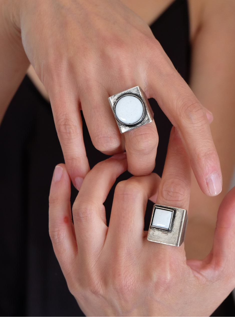 L’anello QUADRATO con smalto bianco è un gioiello dallo stile minimalista e contemporaneo, perfetto per gli amanti del design geometrico e degli anelli chevalier rivisitati in chiave moderna.