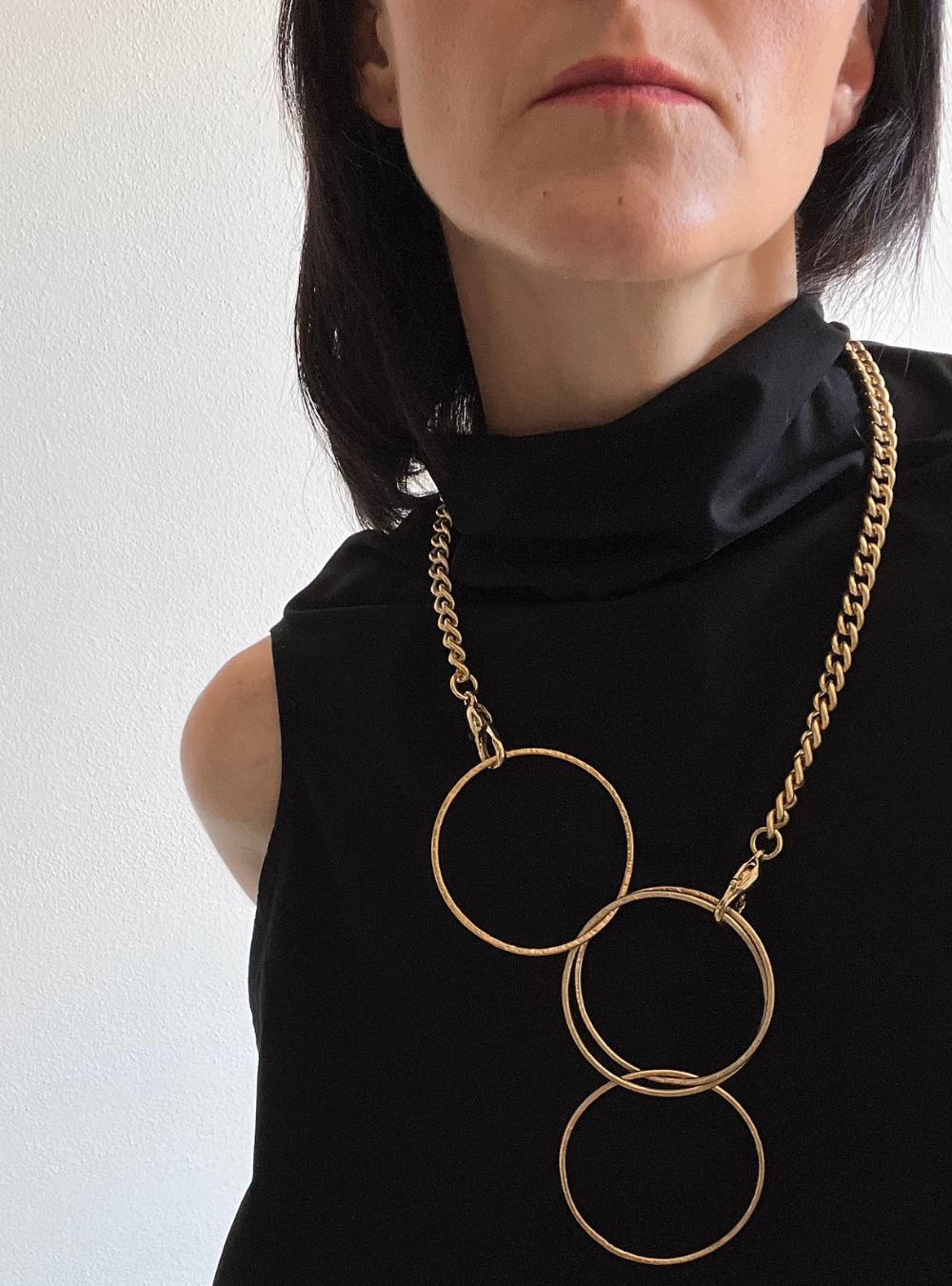 Collana bracciale geometrica è un gioiello artigianale in ottone con rifinitura in oro chiaro satinato con ciondolo a quattro cerchi che diventa un bracciale.