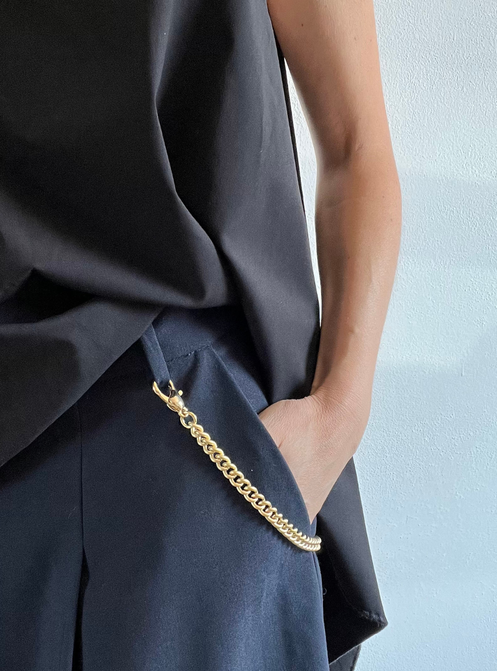 Questo gioiello muli indossabile è pensato per chi vuole distinguersi con un tocco di originalità. La catena presenta due grandi moschettoni all’estremità così da poter essere indossata a girocollo stretta o applicata al ciondolo composto da quattro cerchi in filo martellato. Con questi puoi creare diverse combinazioni oppure indossarli come unico bracciale rigido. Infine puoi applicare la catena alle asole del pantalone aggiungendo un dettaglio particolare al tuo outfit.