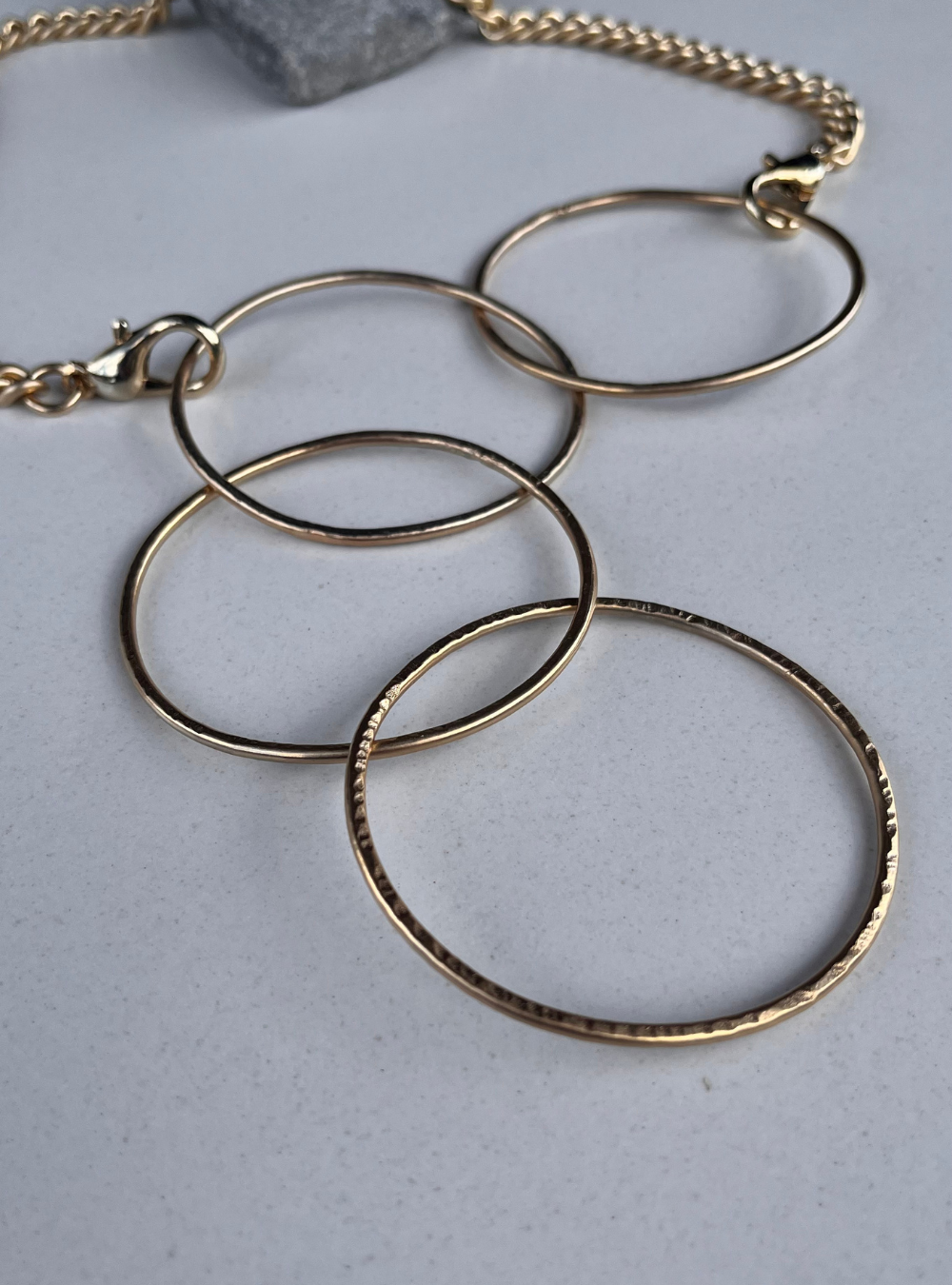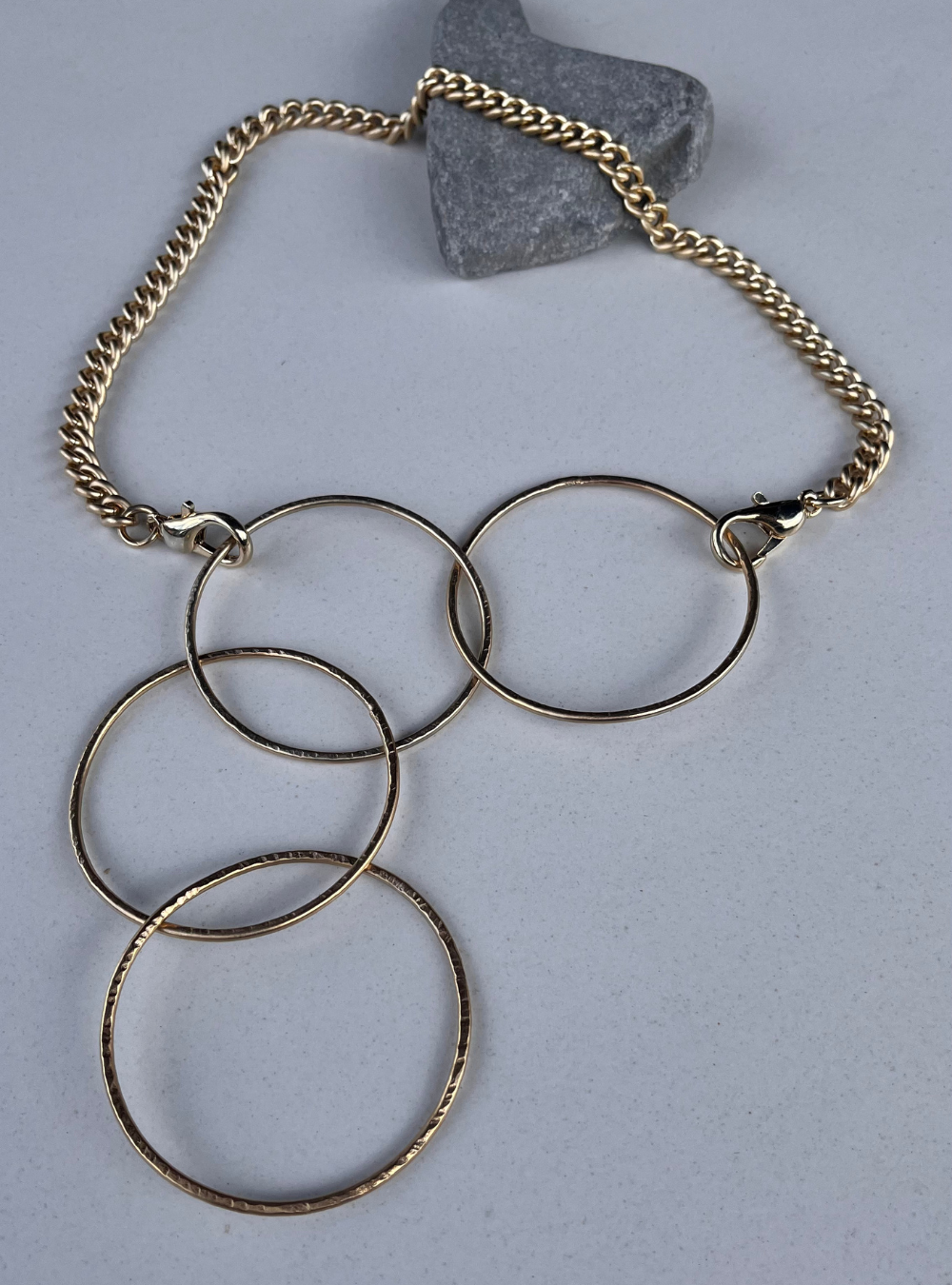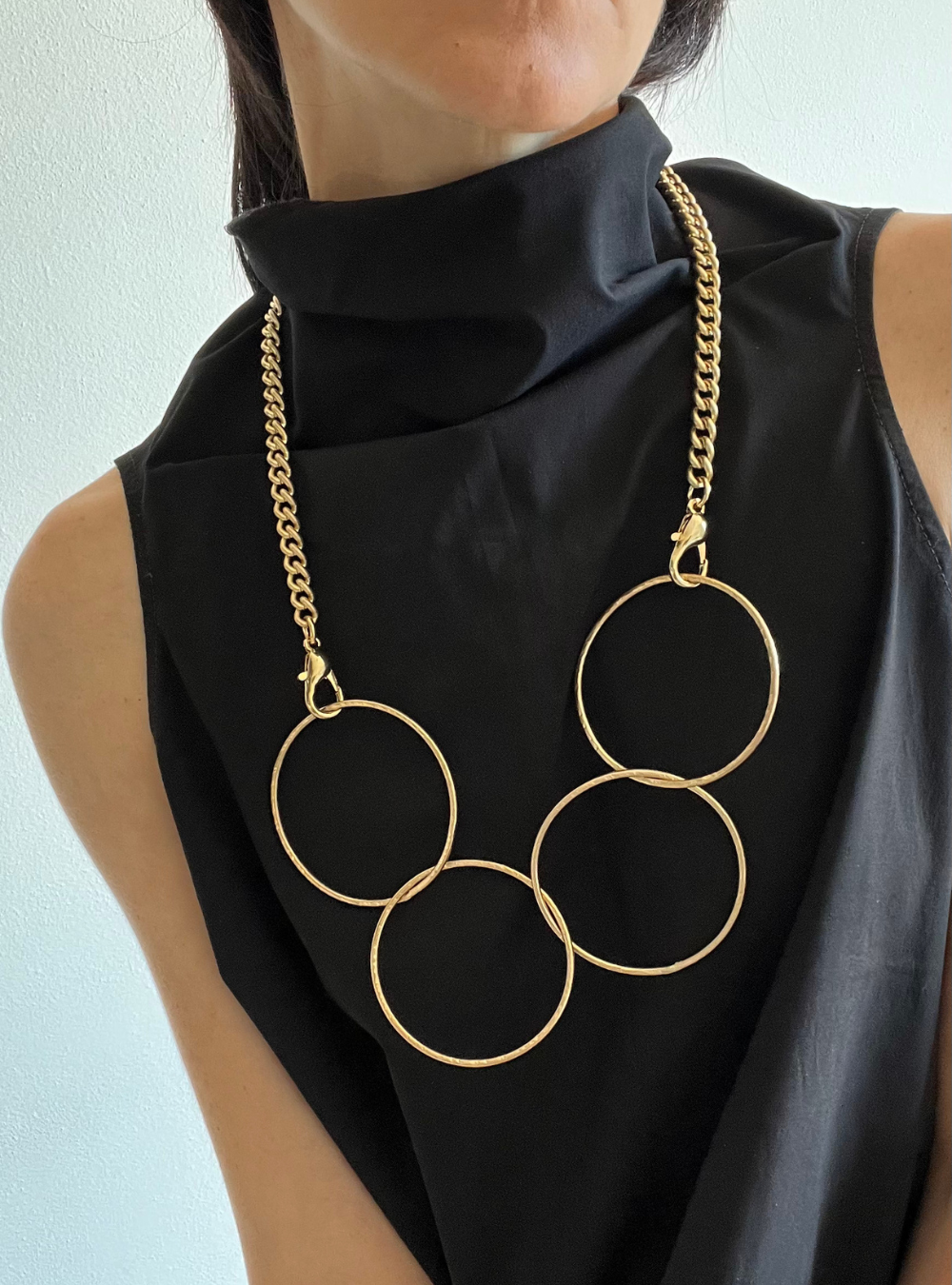La collana bracciale geometrica è un gioiello artigianale in ottone con rifinitura in oro chiaro satinato con ciondolo a quattro cerchi che diventa un bracciale.