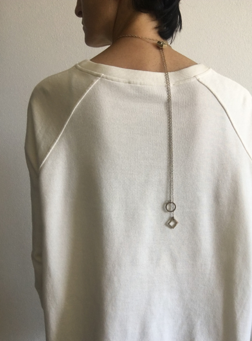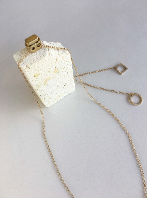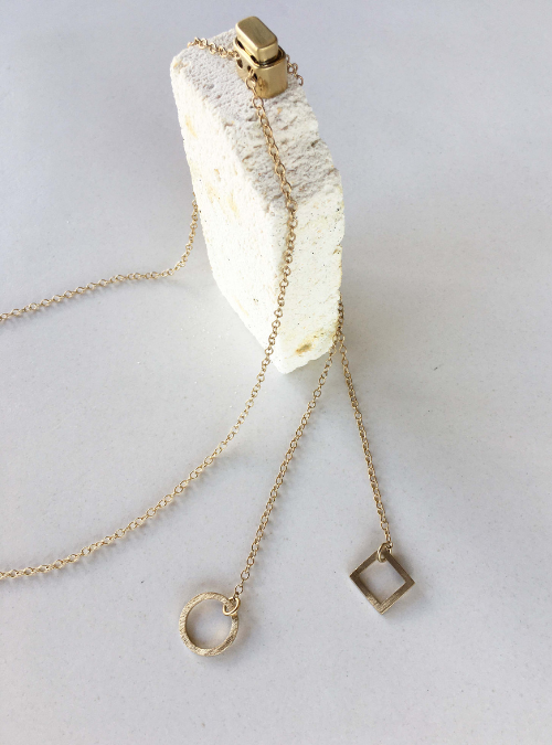 La cosa interessante di questa collana è la sua versatilità, infatti può essere indossata lunga o a girocollo a seconda dell’outfit indossato, grazie al cursore stringi-catena che permette la regolazione lasciando cadere dietro la schiena i due ciondoli geometrici.