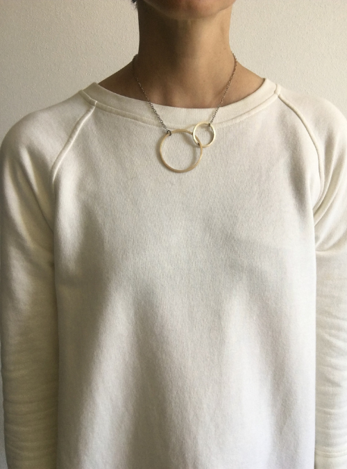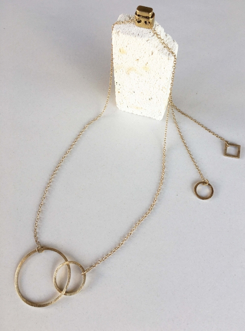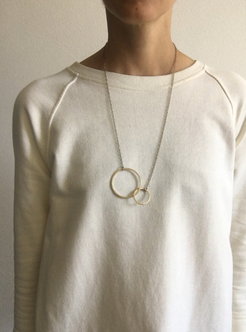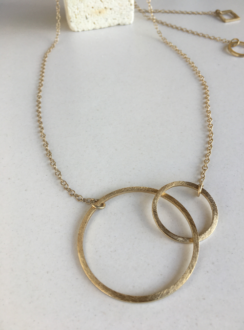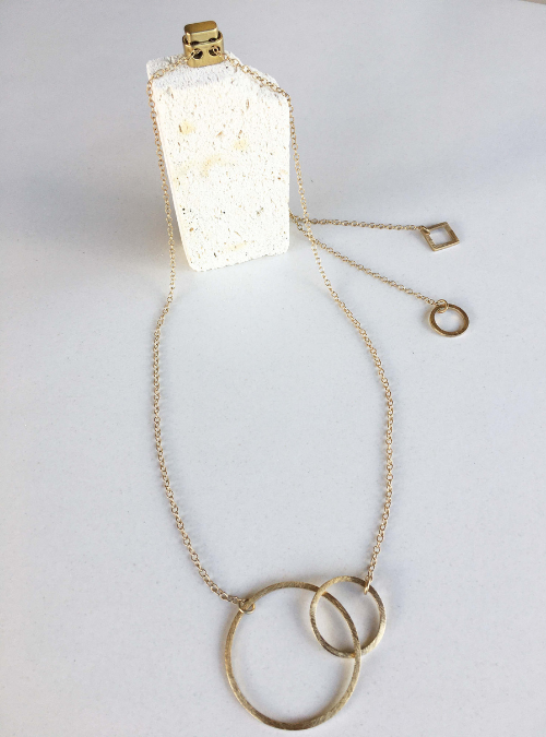 La collana DOPPIO CERCHIO è un gioiello artigianale in ottone con rifinitura in oro chiaro satinato con cursore che regola la lunghezza.