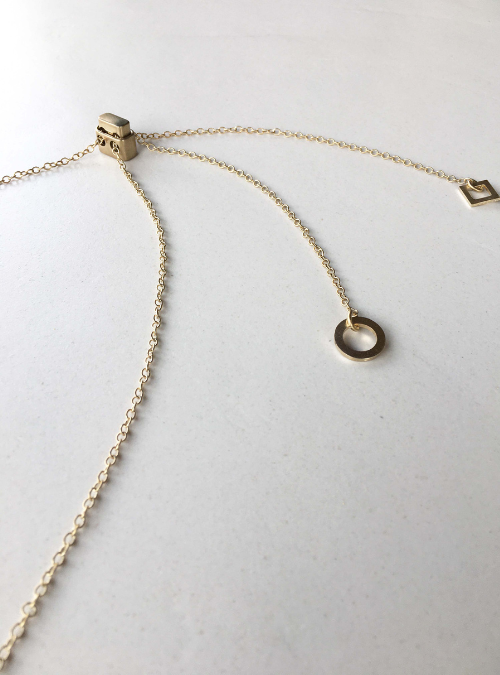 La cosa interessante di questa collana è la sua versatilità, infatti può essere indossata lunga o a girocollo a seconda dell’outfit indossato, grazie al cursore stringi-catena che permette la regolazione lasciando cadere dietro la schiena i due ciondoli geometrici.