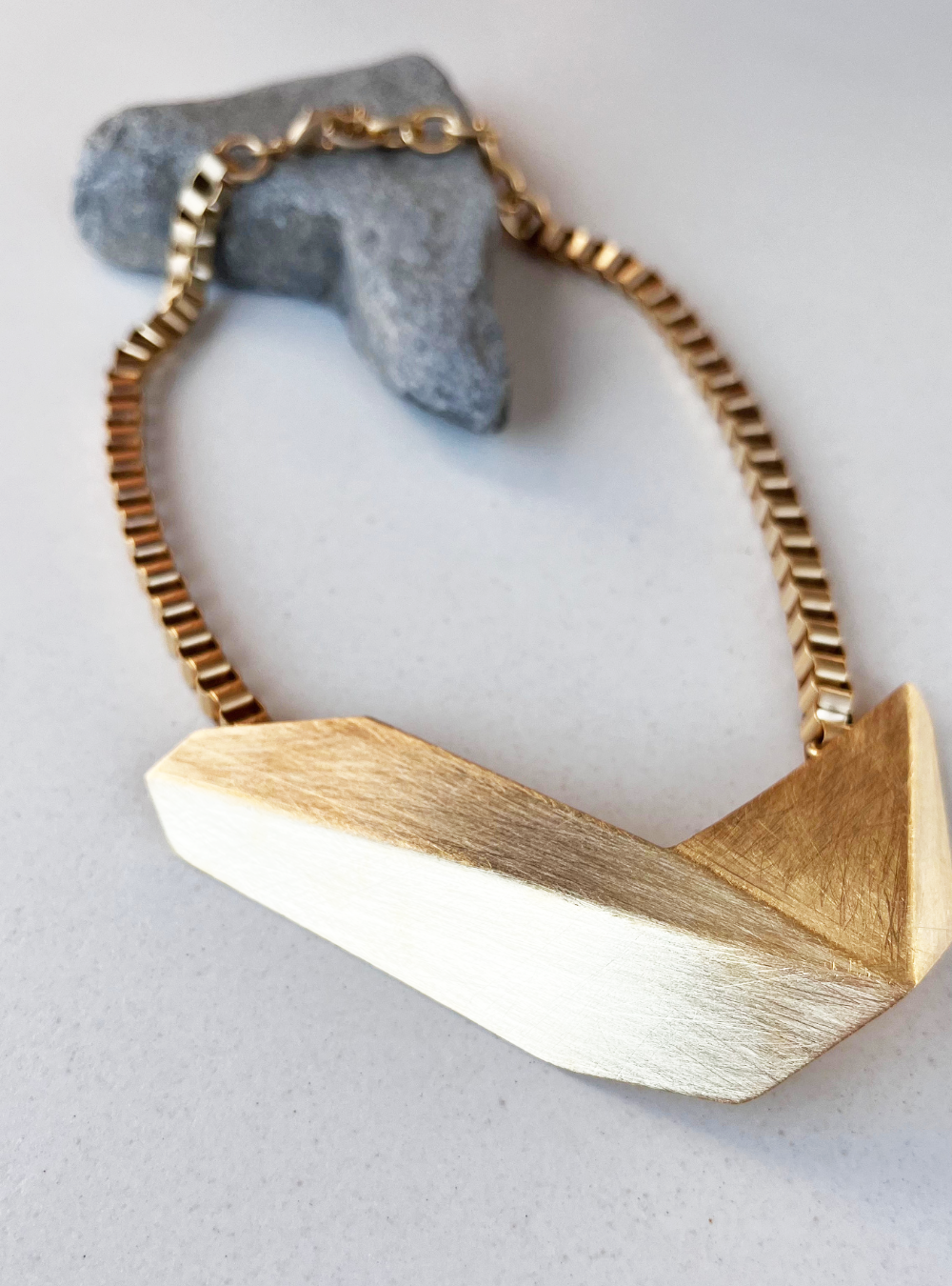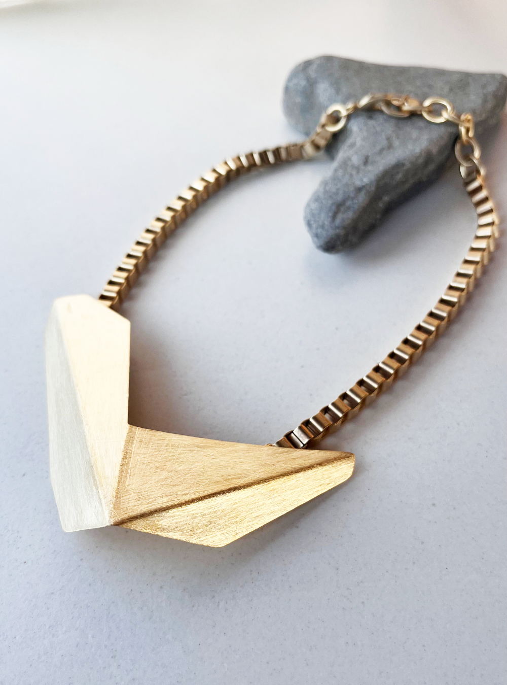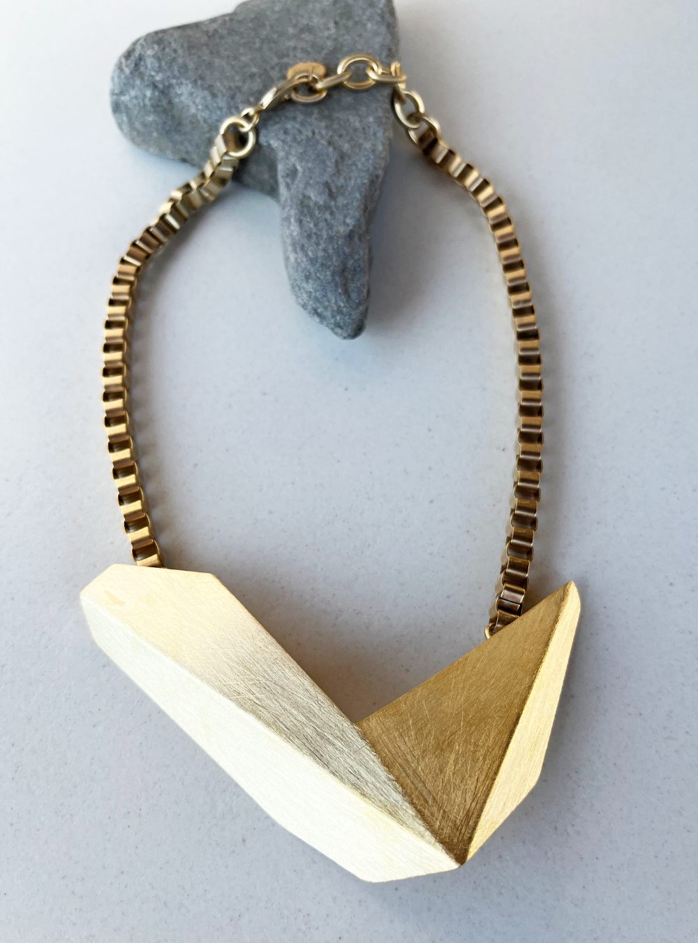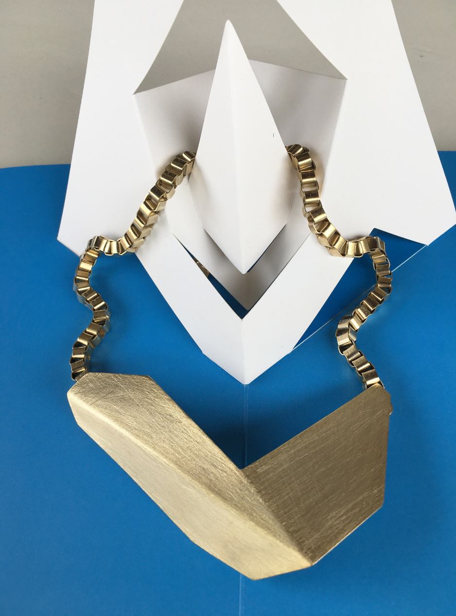 La collana geometrica catena CIGNO è un gioiello artigianale in ottone con rifinitura in oro chiaro satinato con ciondolo in lamina piegata ispirata alle sculture dell’artista designer Bruno Munari.