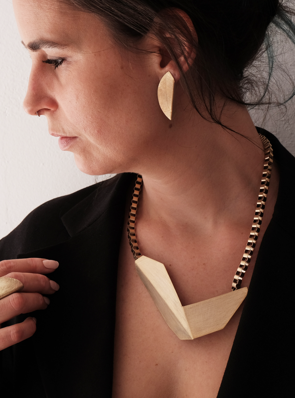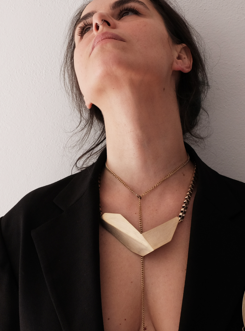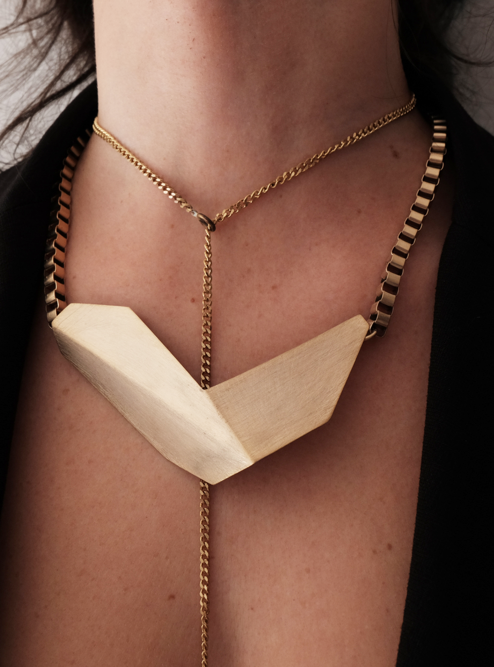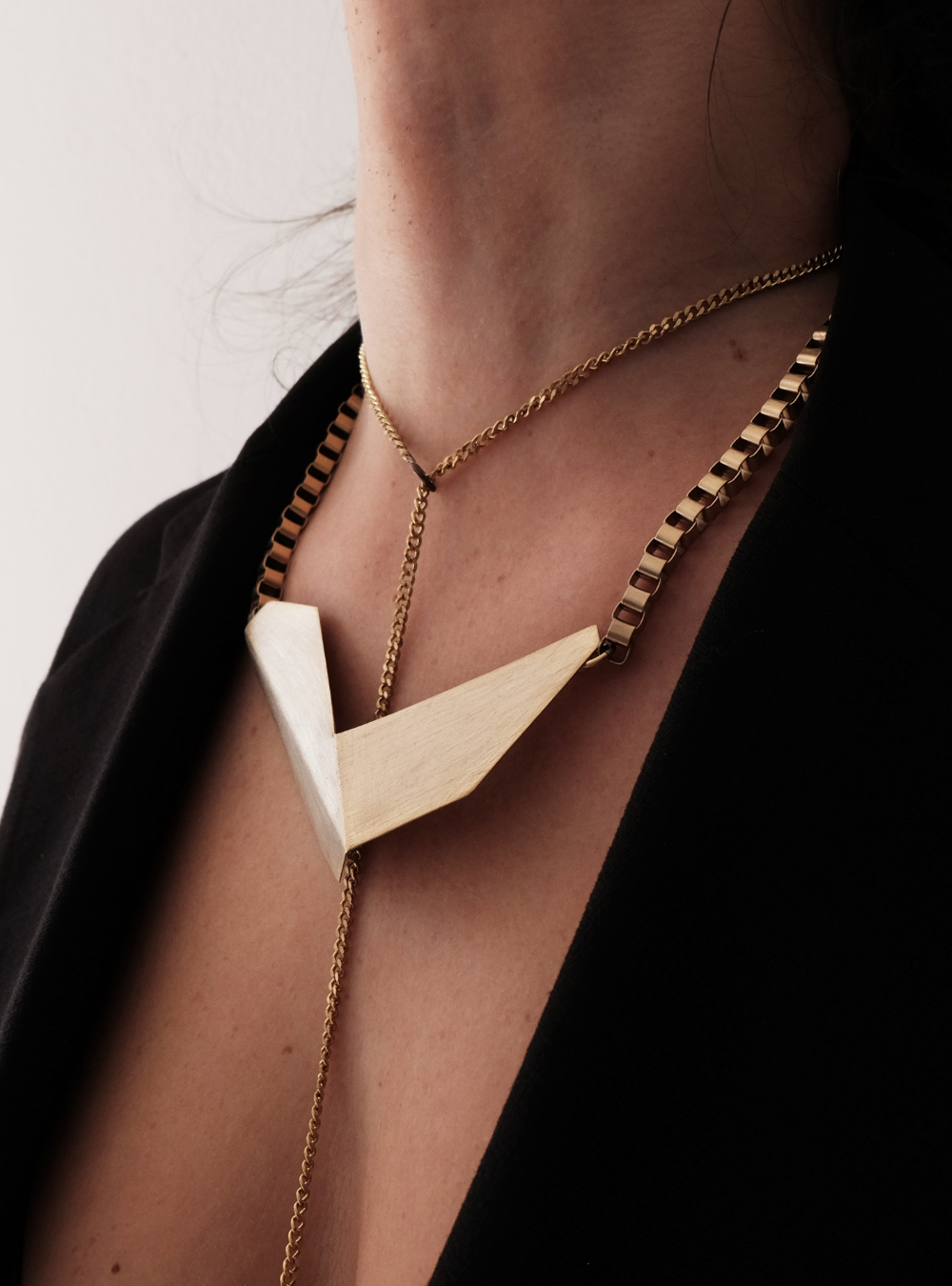 La collana geometrica catena CIGNO è un gioiello artigianale in ottone con rifinitura in oro chiaro satinato con ciondolo in lamina piegata ispirata alle sculture dell’artista designer Bruno Munari.