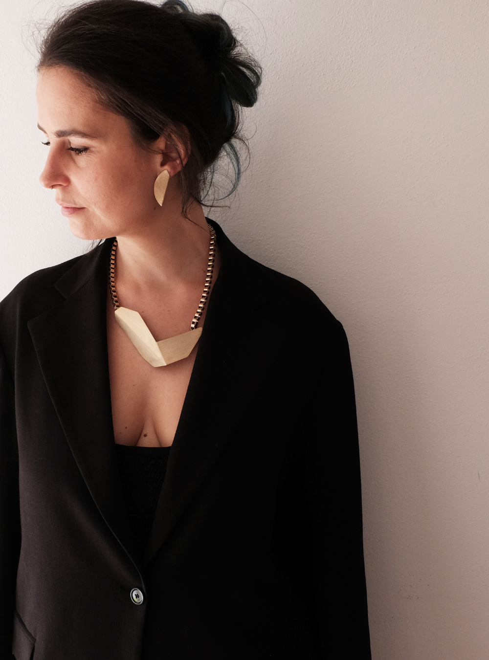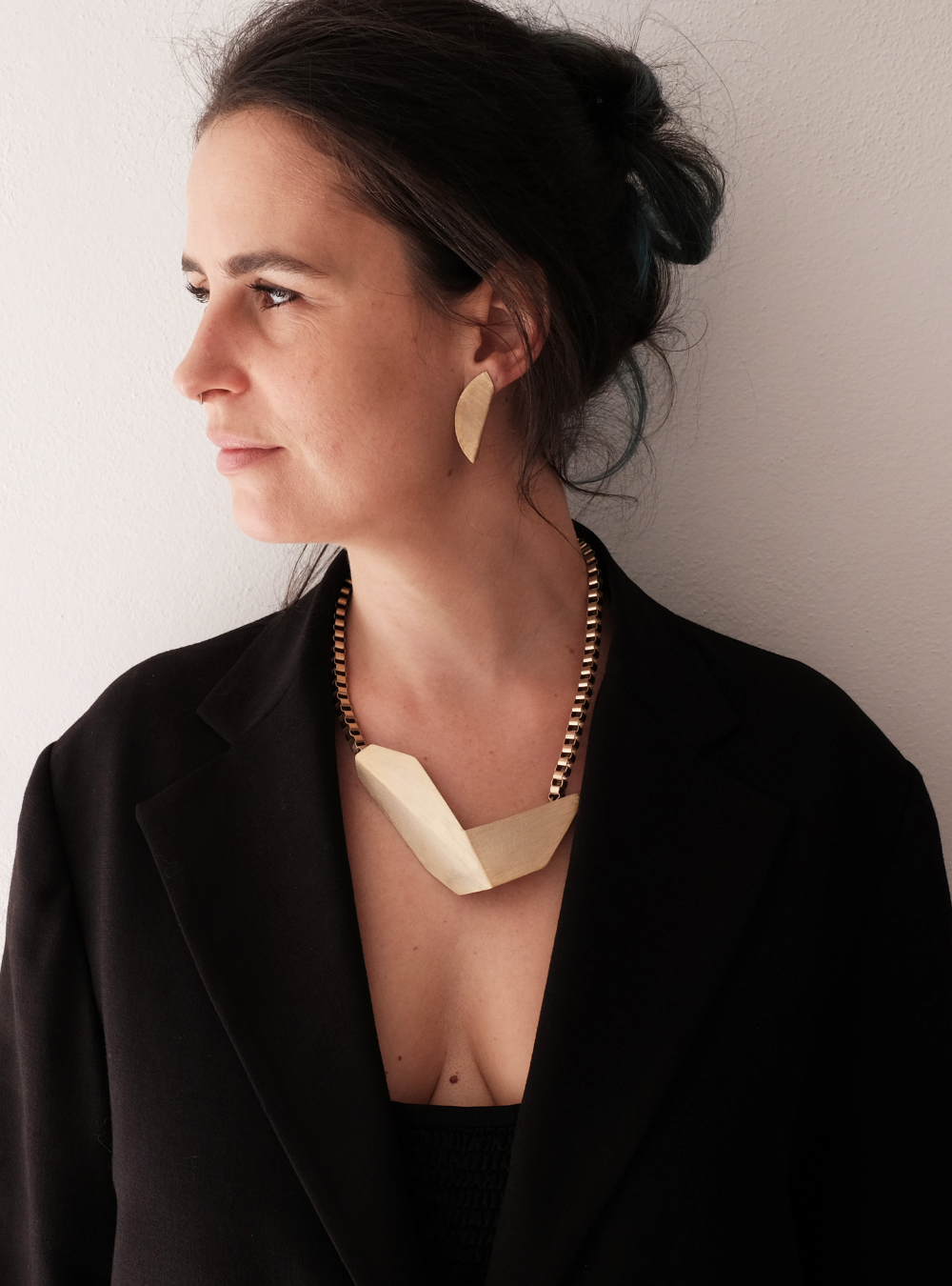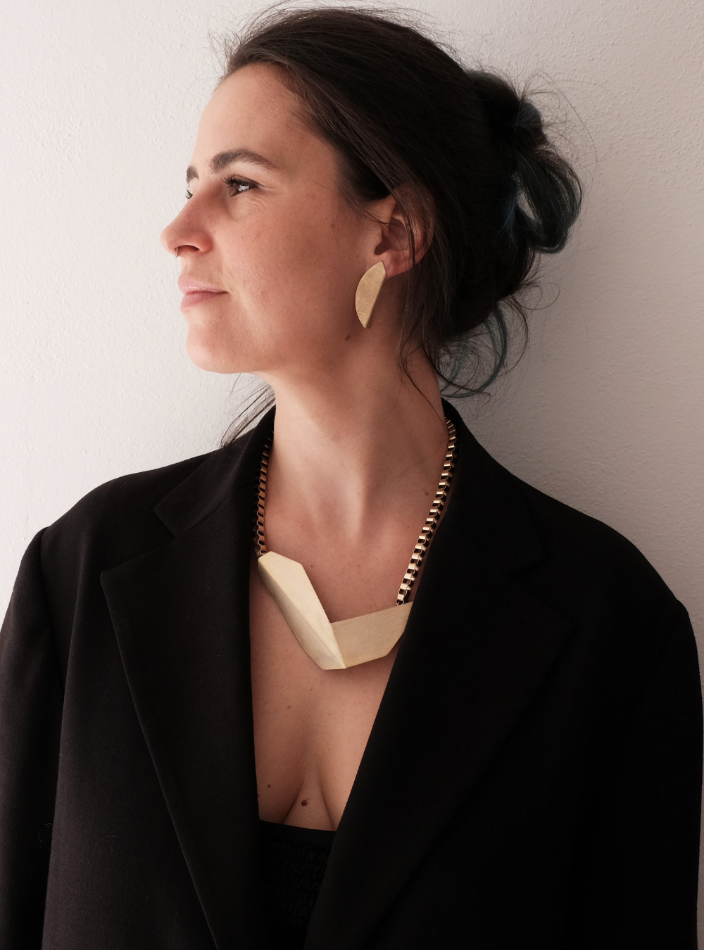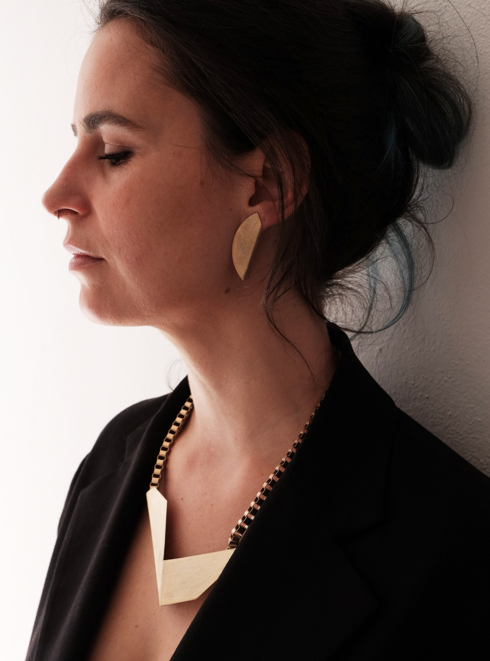 La collana geometrica catena CIGNO è un gioiello artigianale in ottone con rifinitura in oro chiaro satinato con ciondolo in lamina piegata ispirata alle sculture dell’artista designer Bruno Munari.