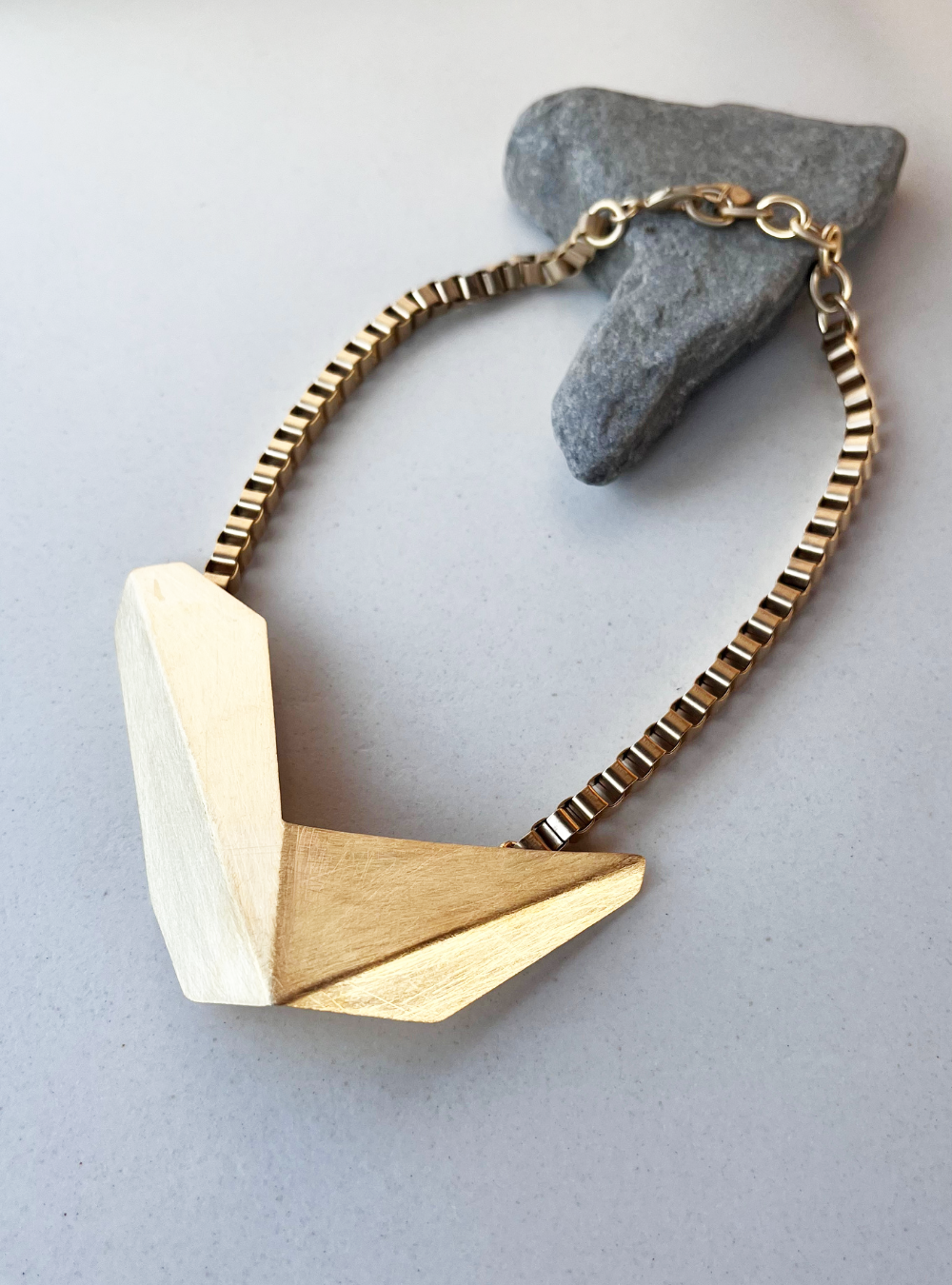 La collana geometrica catena CIGNO è un gioiello artigianale in ottone con rifinitura in oro chiaro satinato con ciondolo in lamina piegata e catena cubica con chiusura a moschettone.
