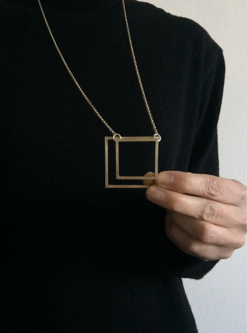 - Design: Ciondolo con due quadrati di misure differenti, uniti da perni saldati, per un effetto di sovrapposizione geometrica. Ingombro del ciondolo: 4,6 cm