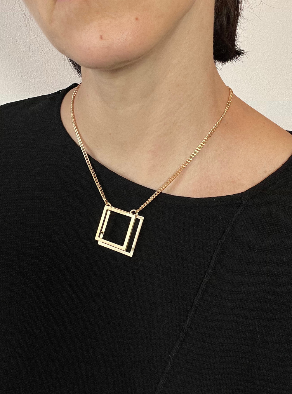 - Design: Ciondolo con due quadrati di misure differenti, uniti da perni saldati, per un effetto di sovrapposizione geometrica. Ingombro del ciondolo: 3,8 cm