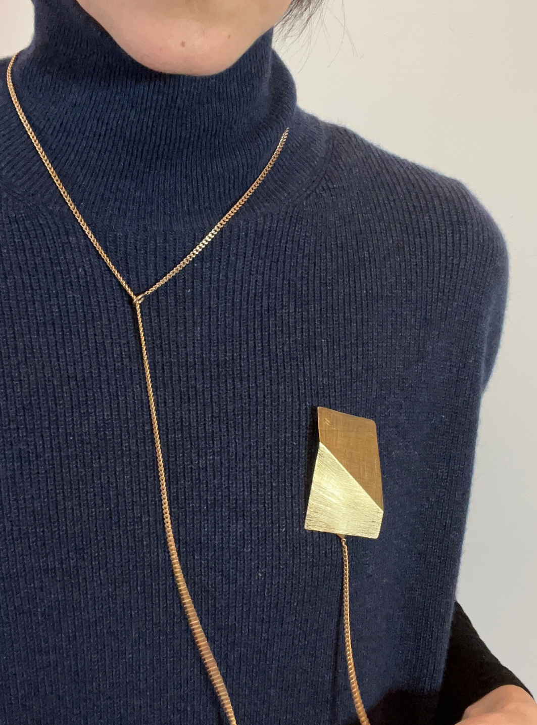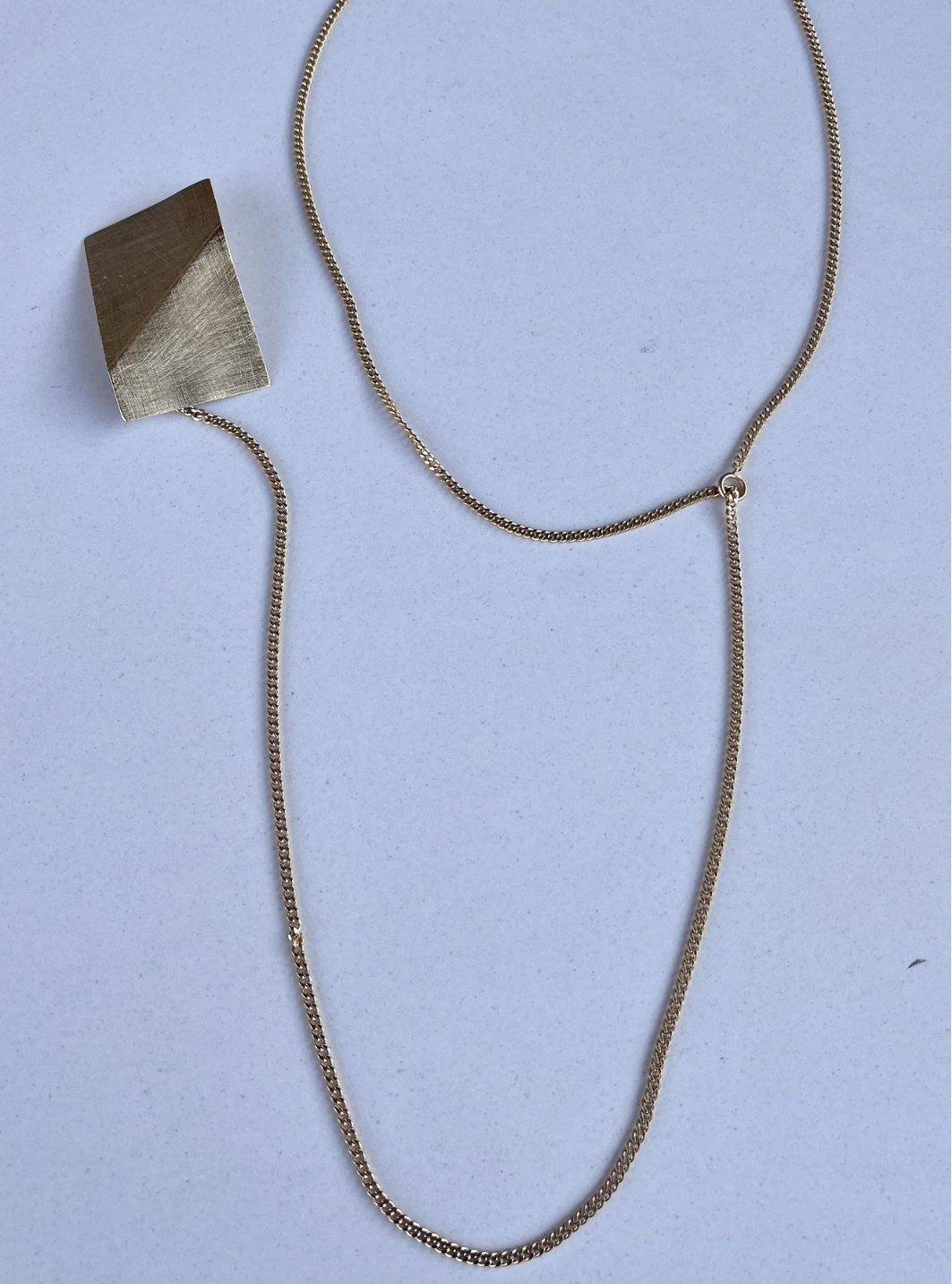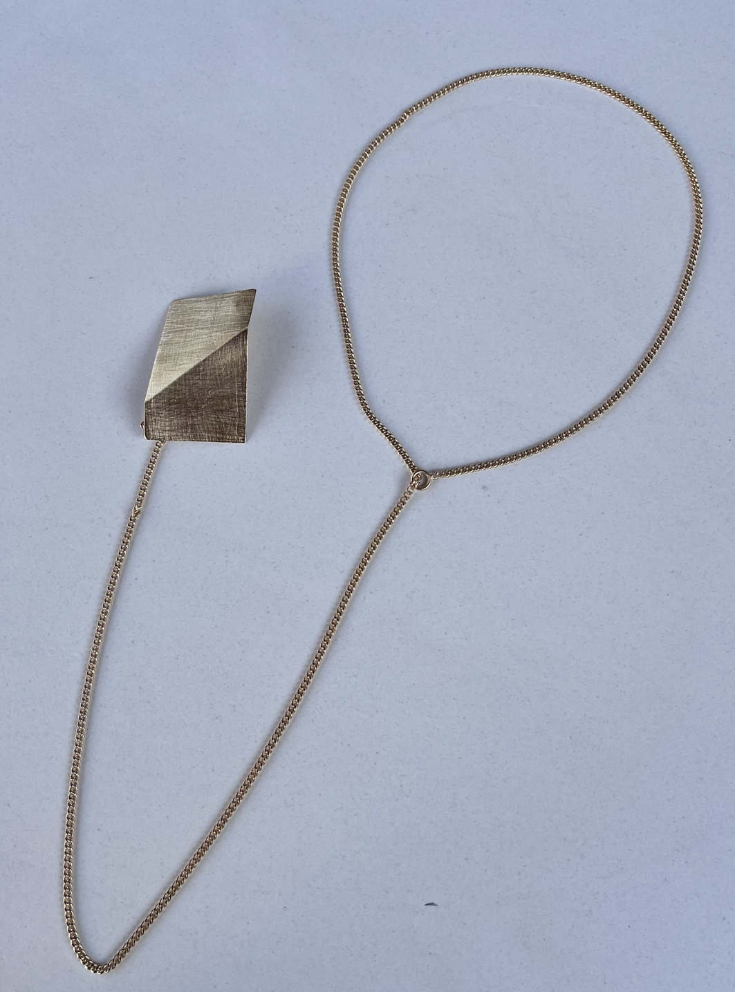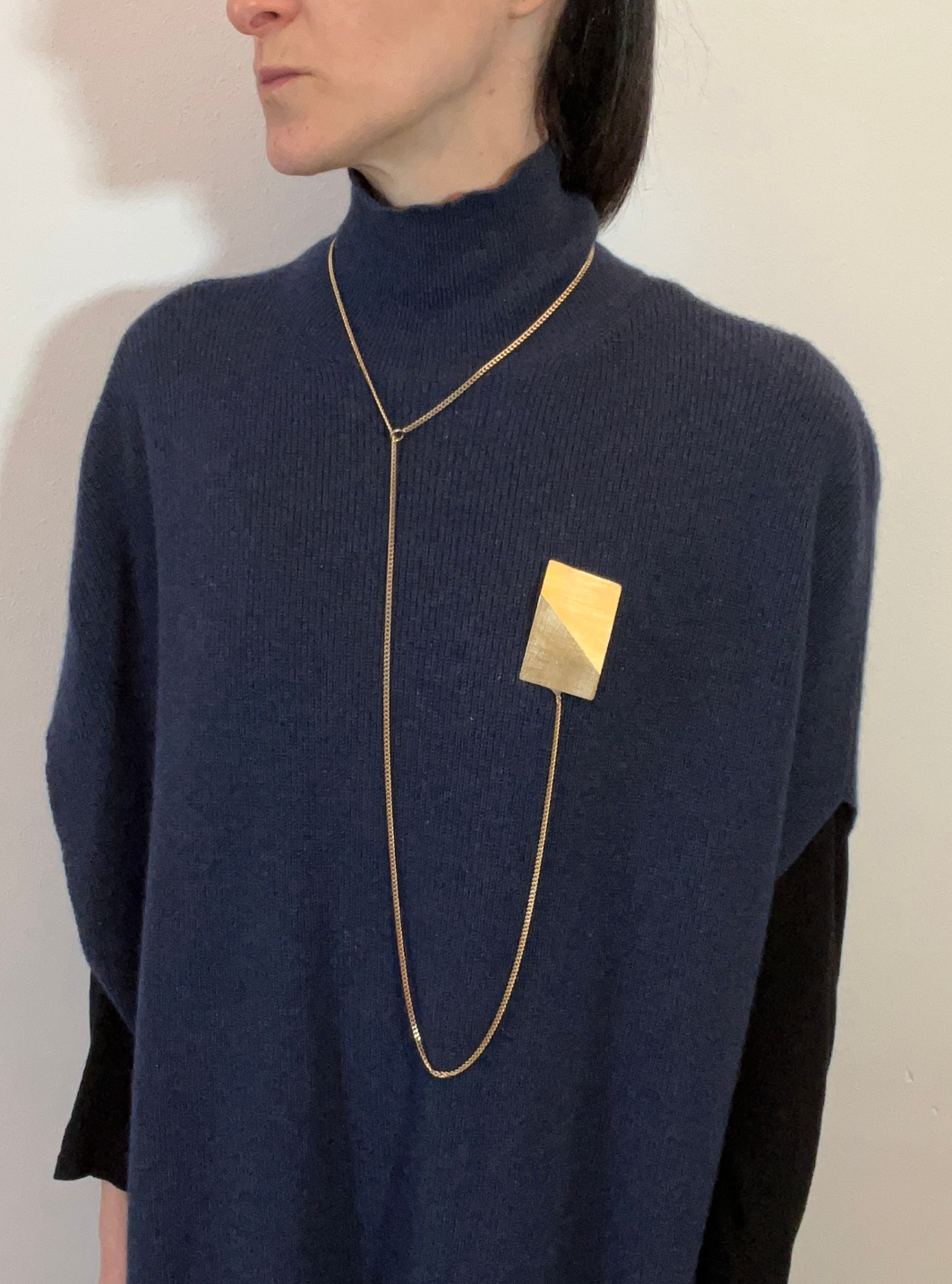 La collana spilla SU & GIÙ è un gioiello artigianale in ottone con rifinitura superficiale in oro chiaro satinato con spilla collegata alla catena estraibile