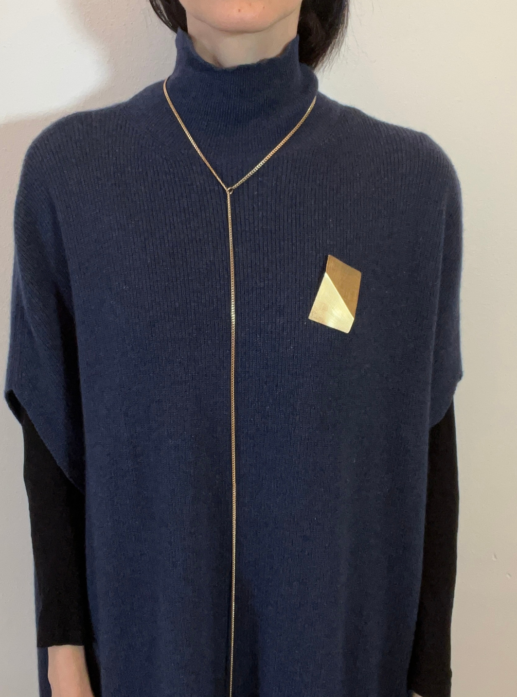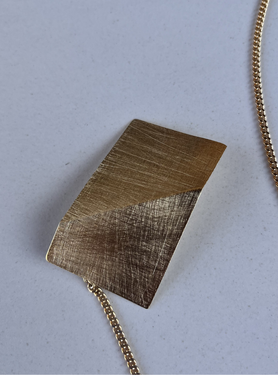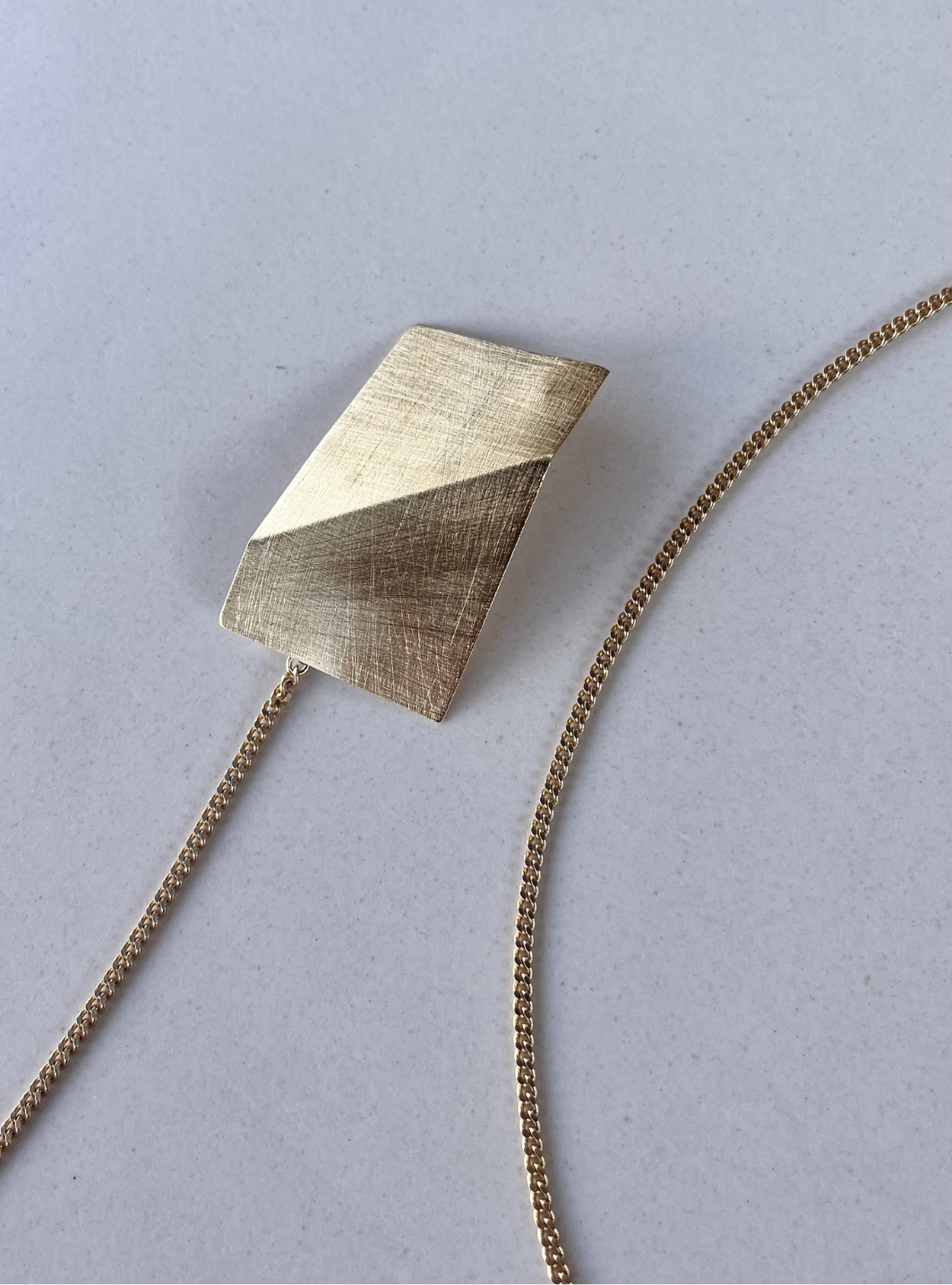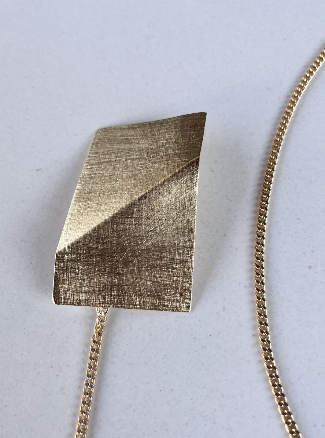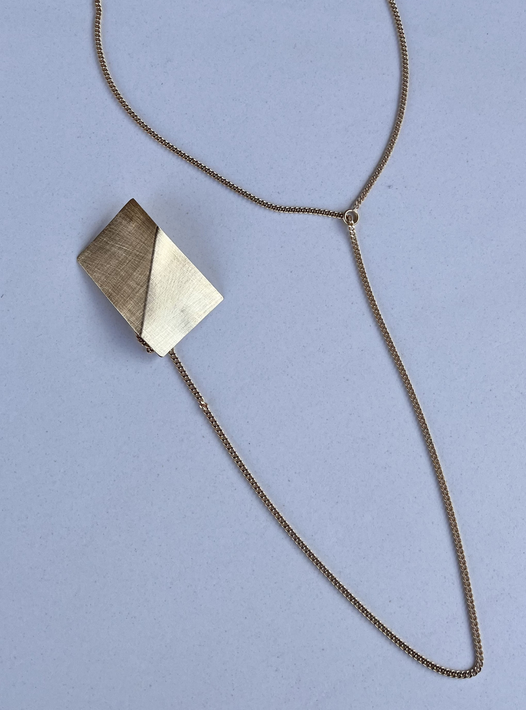 La collana spilla SU & GIÙ è un gioiello artigianale in ottone con rifinitura superficiale in oro chiaro satinato con spilla collegata alla catena estraibile