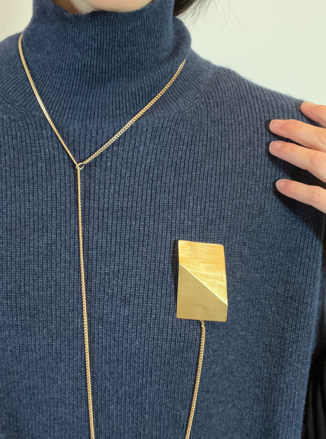 La spilla rettangolare, lavorata e piegata in modo asimmetrico al centro, si trasforma da superficie bidimensionale a volume tridimensionale.