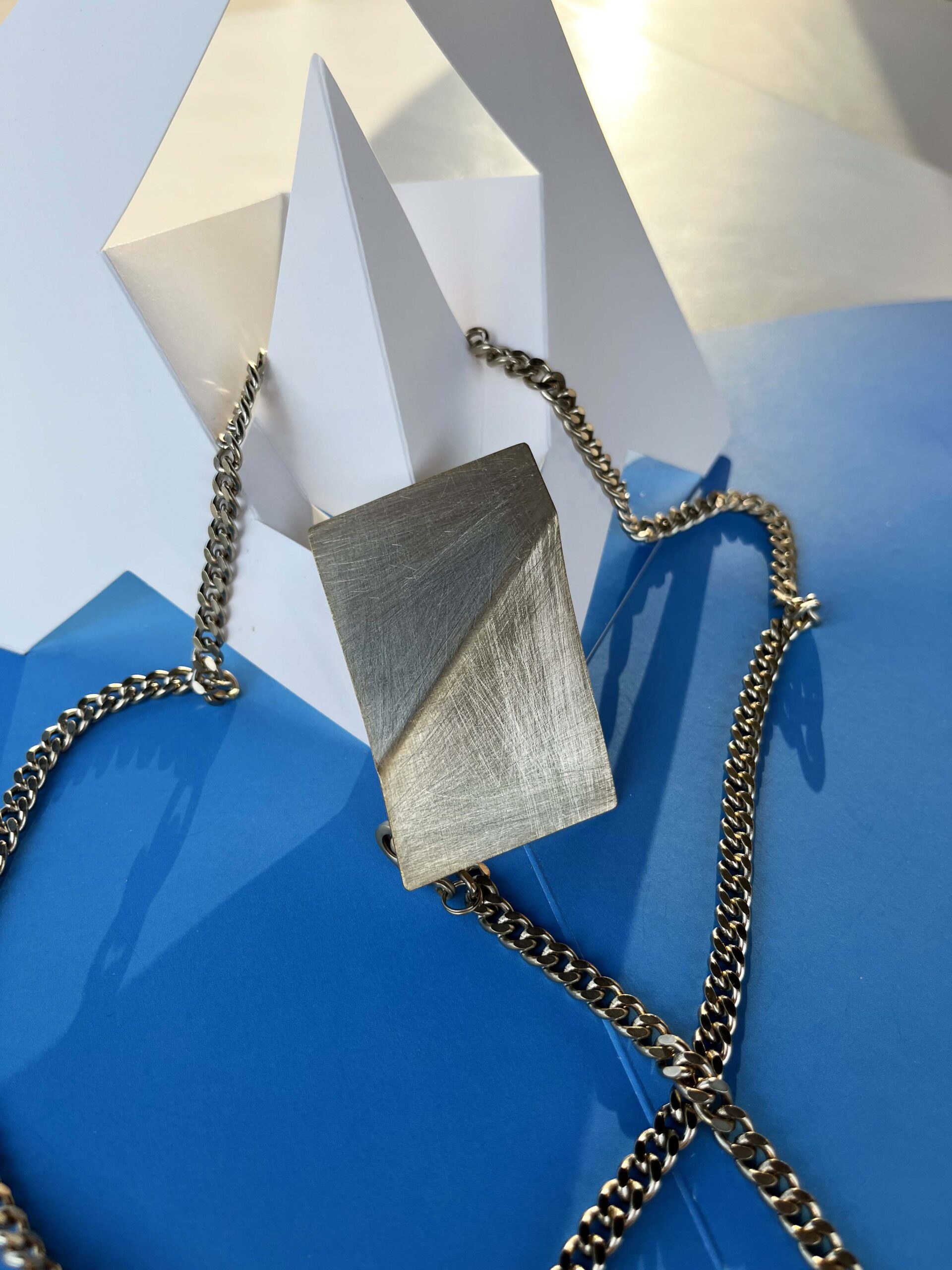 La collana geometrica SU & GIÙ nasce dall’osservazione e dalla ricerca estetica di Bruno Munari, maestro dell’arte e del design italiano. Come nelle sue celebri sculture da viaggio, l’idea parte da un gesto semplice il ritaglio del foglio e la piegatura della superficie, che genera nuovi spazi, volumi e sensazioni di equilibrio visivo.