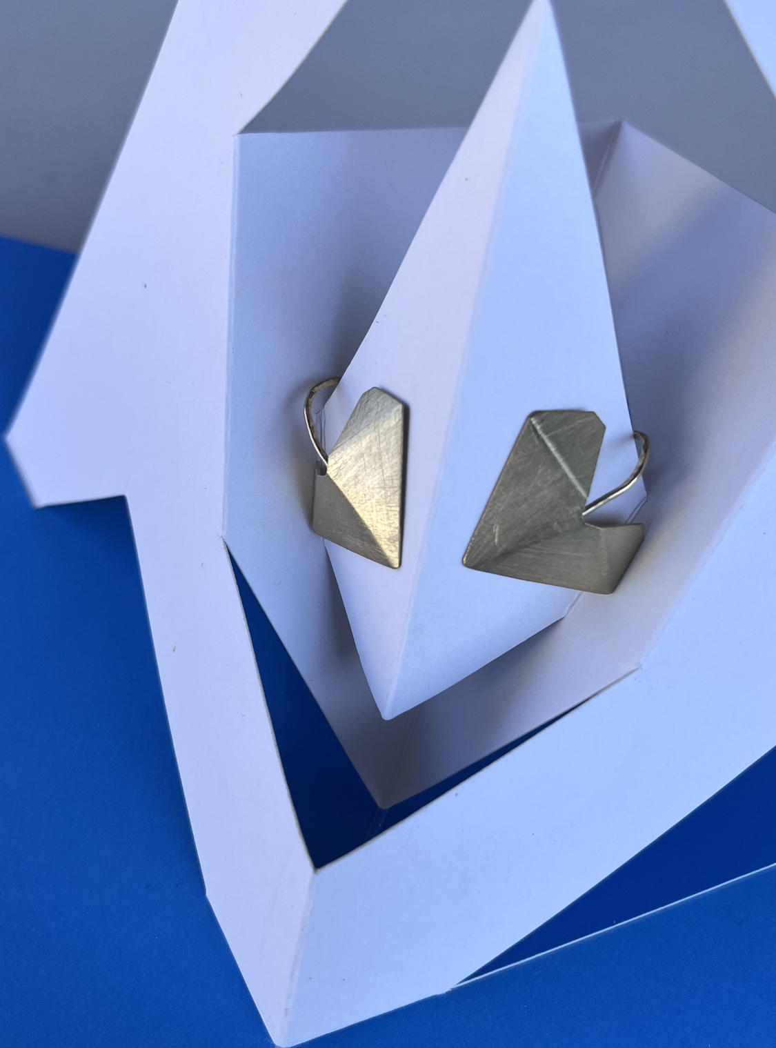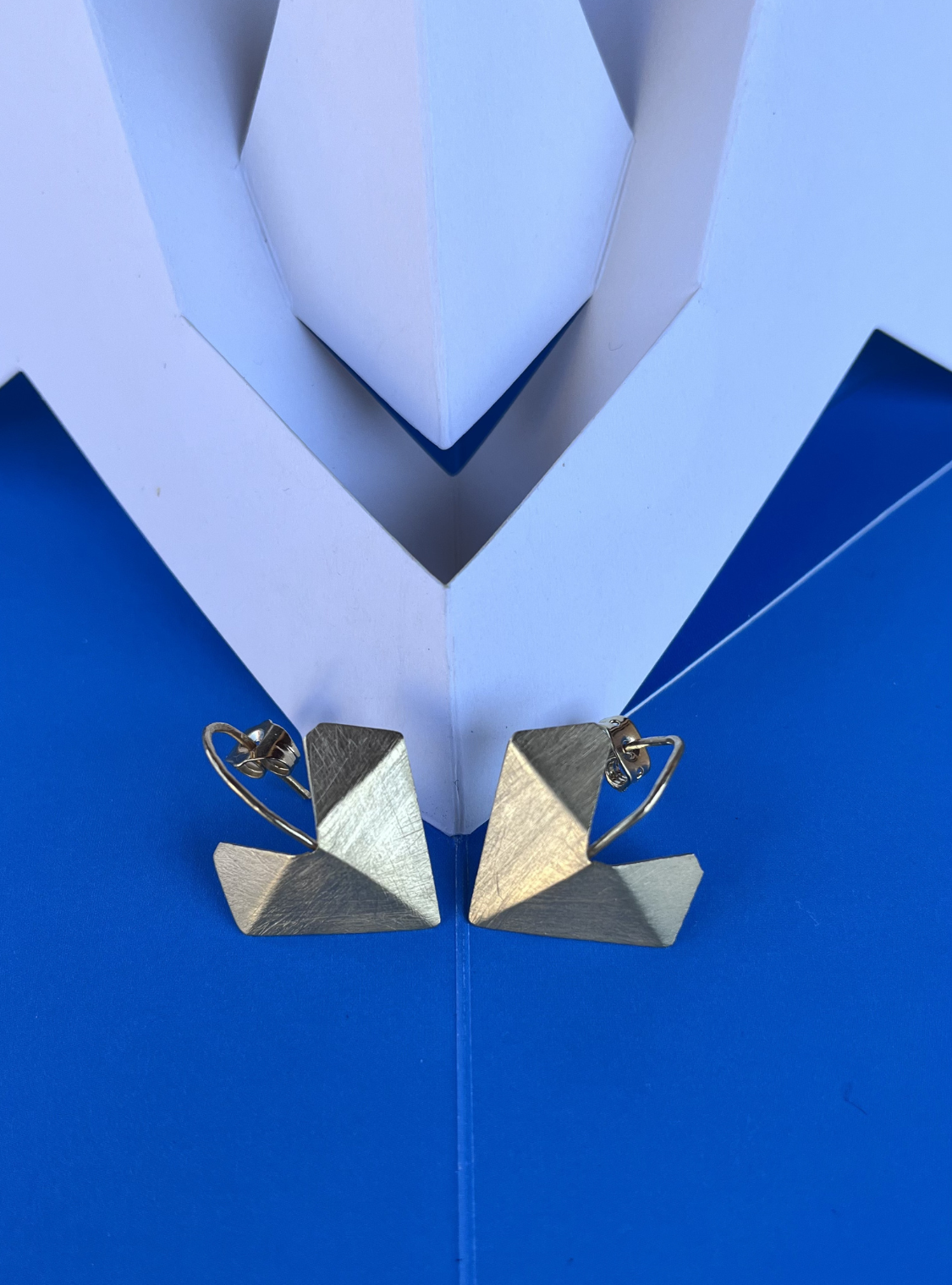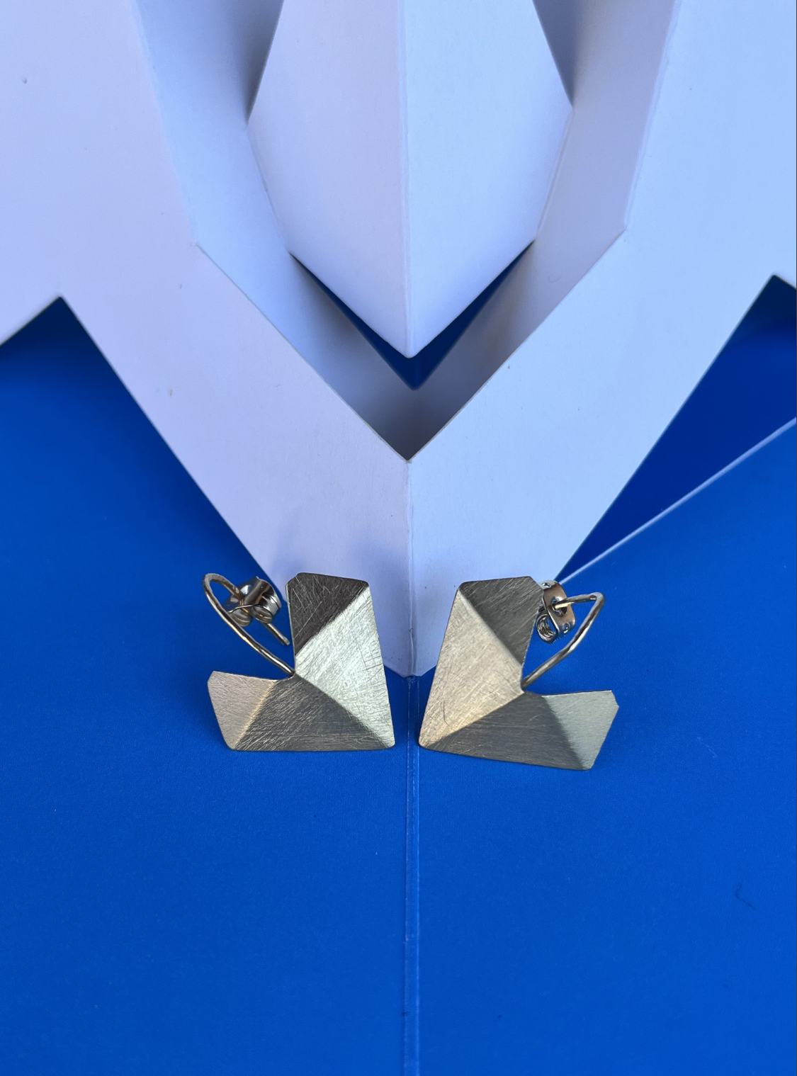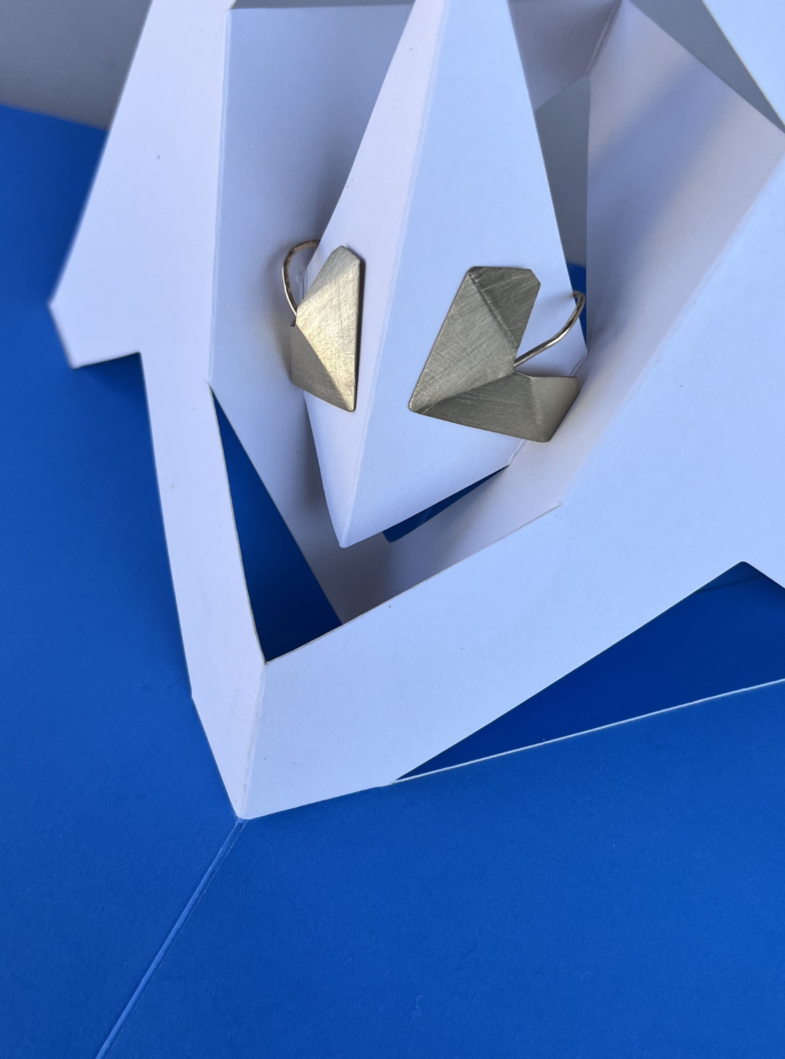 Ispirati dall’estetica innovativa e alle sculture da viaggio di Bruno Munari, questi orecchini in lamina di ottone rappresentano una fusione di arte e design. Tra le sue sperimentazioni più affascinanti troviamo l‘arte degli origami, che Munari ha esplorato e reinterpretato con la sua tipica creatività. L’artista non si limitò a riprodurre forme tradizionali, ma le usò come punto di partenza per indagare il potenziale espressivo della carta, materia che gli offriva infinite possibilità di trasformazione. La carta, con la sua capacità di trasformarsi, diventò per Munari un mezzo per esplorare il concetto di “vuoto” e “pieno”, e per giocare con le percezioni visive.
