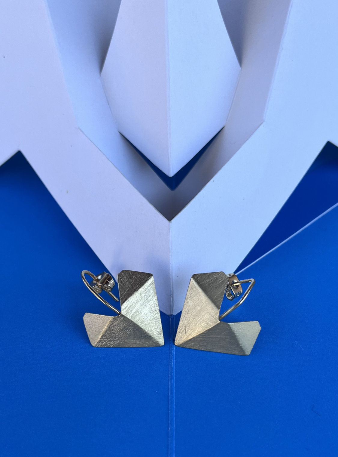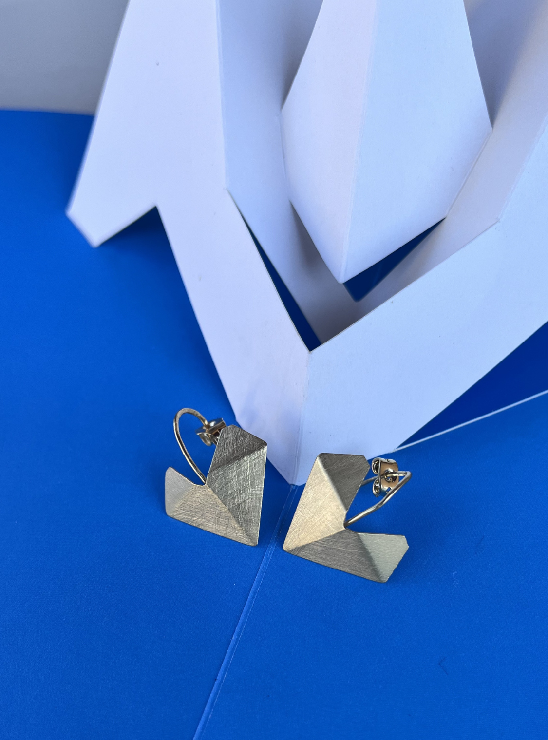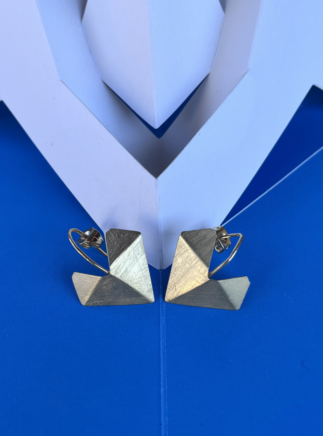 Ispirati dall’estetica innovativa e alle sculture da viaggio di Bruno Munari, questi orecchini in lamina di ottone rappresentano una fusione di arte e design. Tra le sue sperimentazioni più affascinanti troviamo l‘arte degli origami, che Munari ha esplorato e reinterpretato con la sua tipica creatività. L’artista non si limitò a riprodurre forme tradizionali, ma le usò come punto di partenza per indagare il potenziale espressivo della carta, materia che gli offriva infinite possibilità di trasformazione. La carta, con la sua capacità di trasformarsi, diventò per Munari un mezzo per esplorare il concetto di “vuoto” e “pieno”, e per giocare con le percezioni visive.
