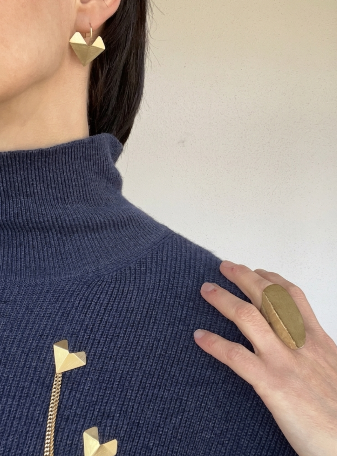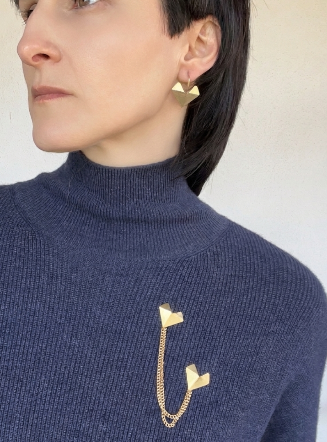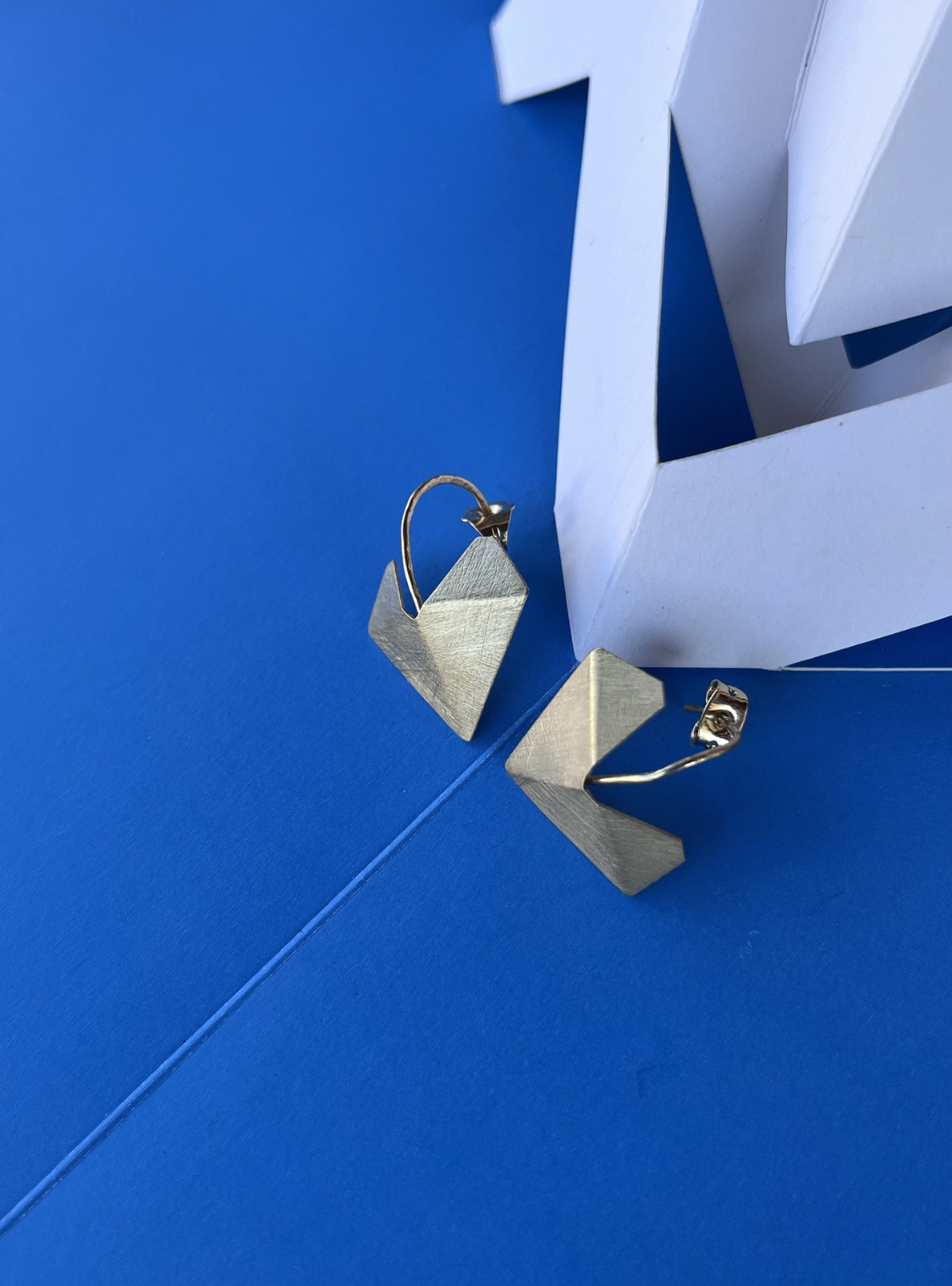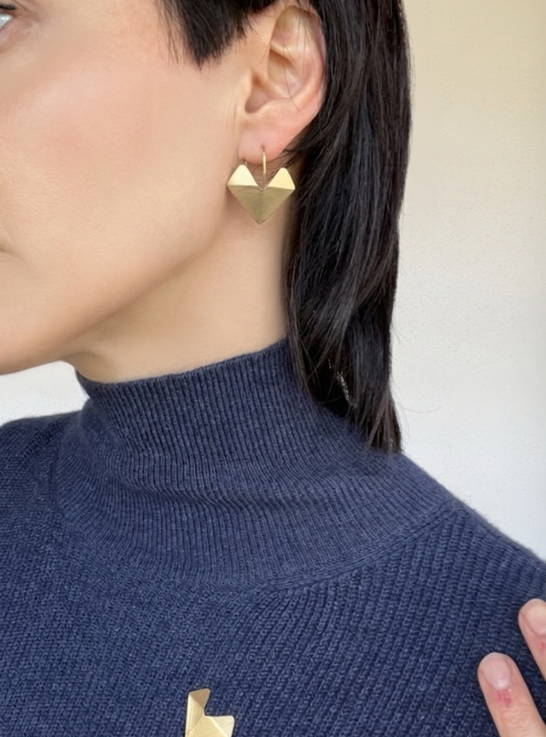 Ispirati dall’estetica innovativa e alle sculture da viaggio di Bruno Munari, questi orecchini in lamina di ottone rappresentano una fusione di arte e design. Tra le sue sperimentazioni più affascinanti troviamo l‘arte degli origami, che Munari ha esplorato e reinterpretato con la sua tipica creatività. L’artista non si limitò a riprodurre forme tradizionali, ma le usò come punto di partenza per indagare il potenziale espressivo della carta, materia che gli offriva infinite possibilità di trasformazione. La carta, con la sua capacità di trasformarsi, diventò per Munari un mezzo per esplorare il concetto di “vuoto” e “pieno”, e per giocare con le percezioni visive.