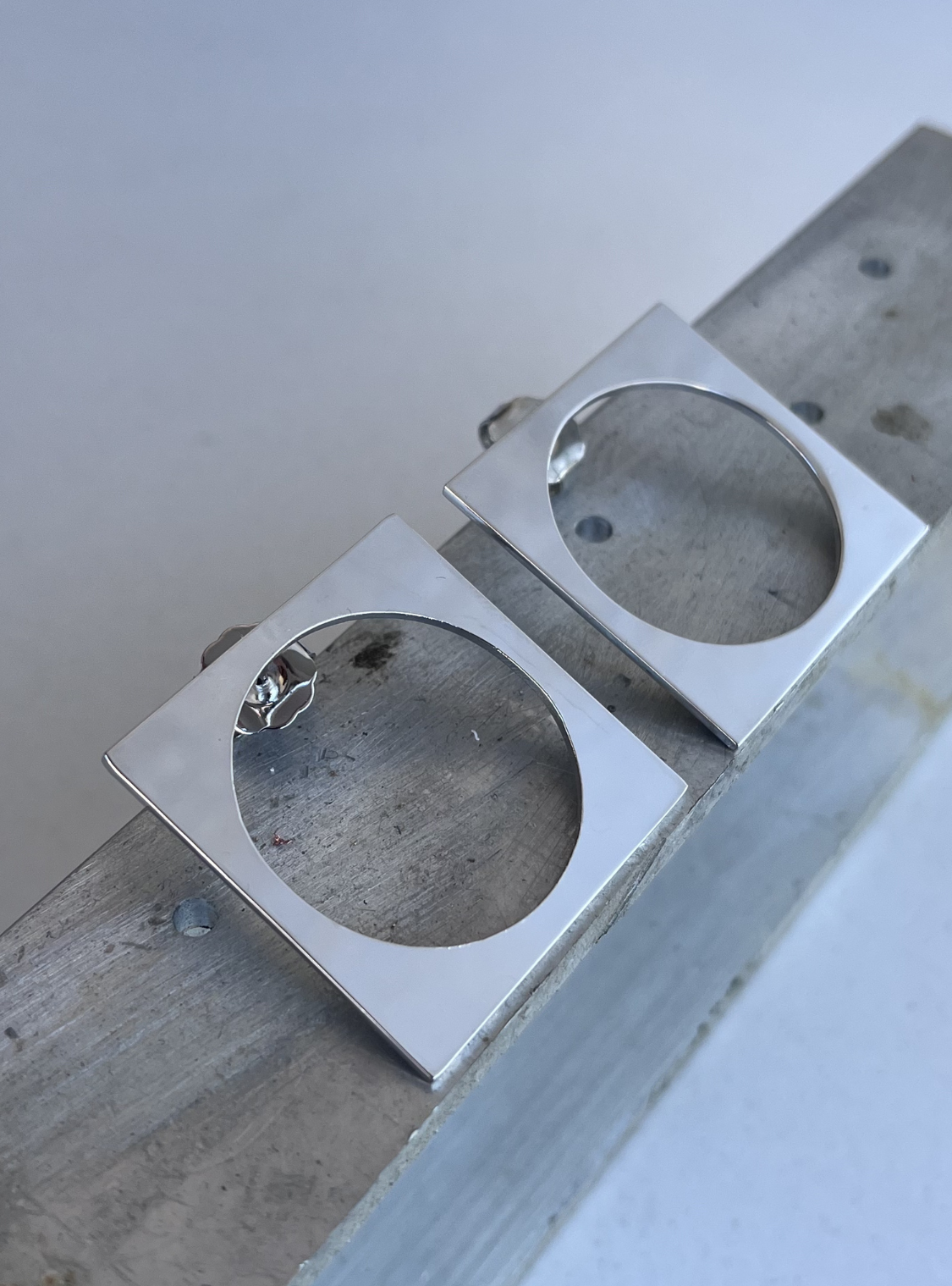 Gli orecchini QUADRATO CERCHIO piccoli sono gioielli in ottone con rifinitura superficiale in argento.