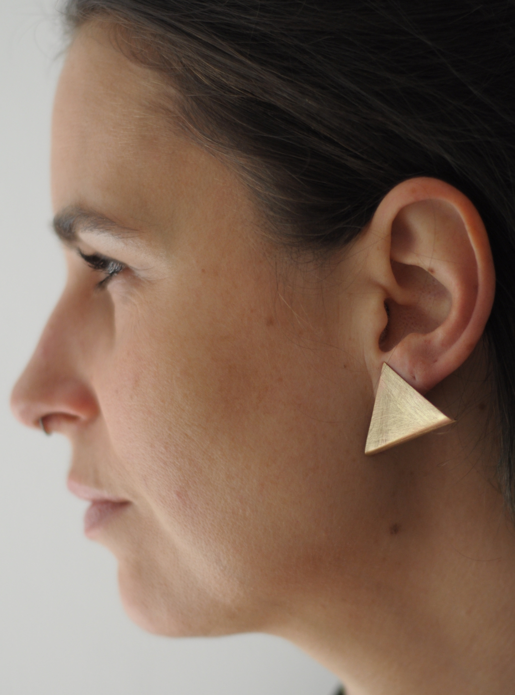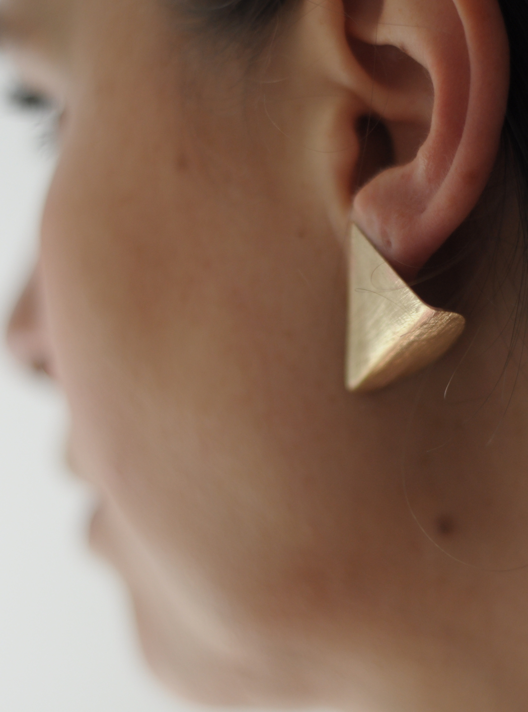 La forma asimmetrica degli orecchini SIMMETRIA MOMENTANEA presenta una linea curva che si appoggia sul contorno del viso lasciando intravedere un piccolo triangolo nel ruotare la testa in un gioco tra luce e le ombre, evocando lo stesso senso di trasformazione leggerezza che Munari cercava nelle sue opere.