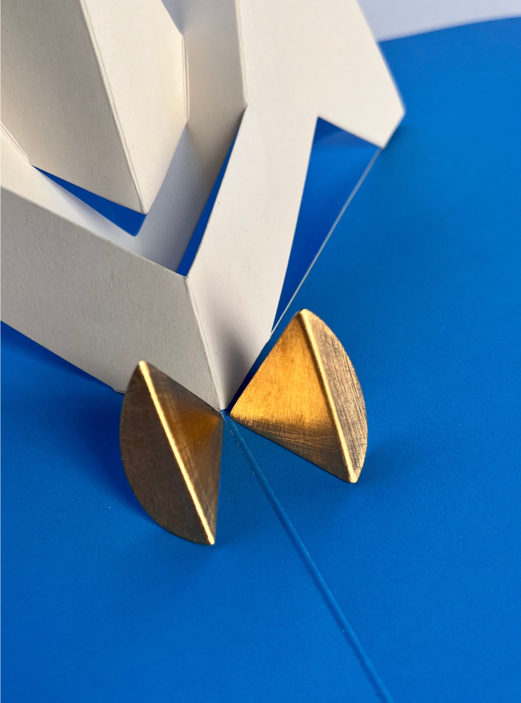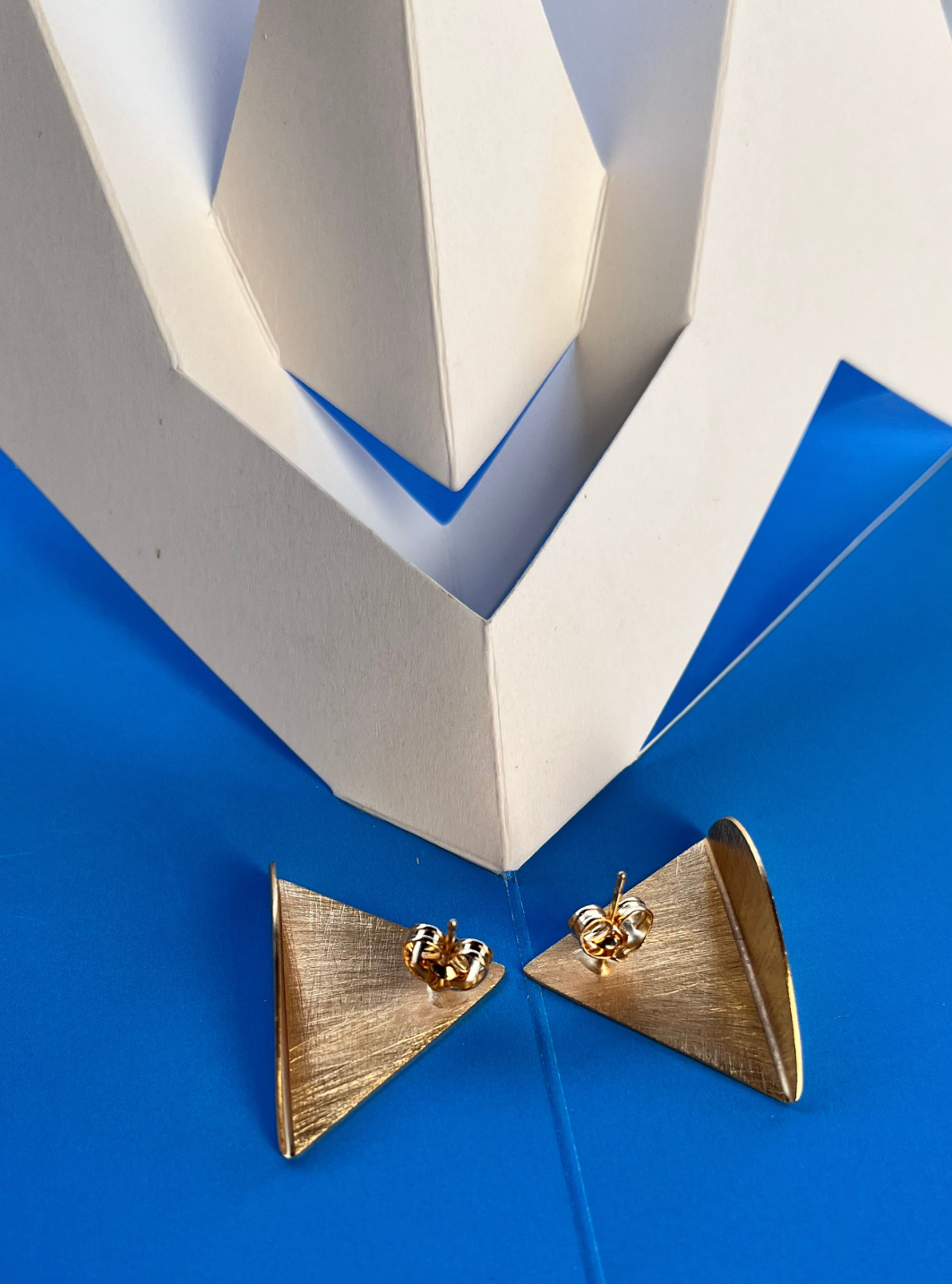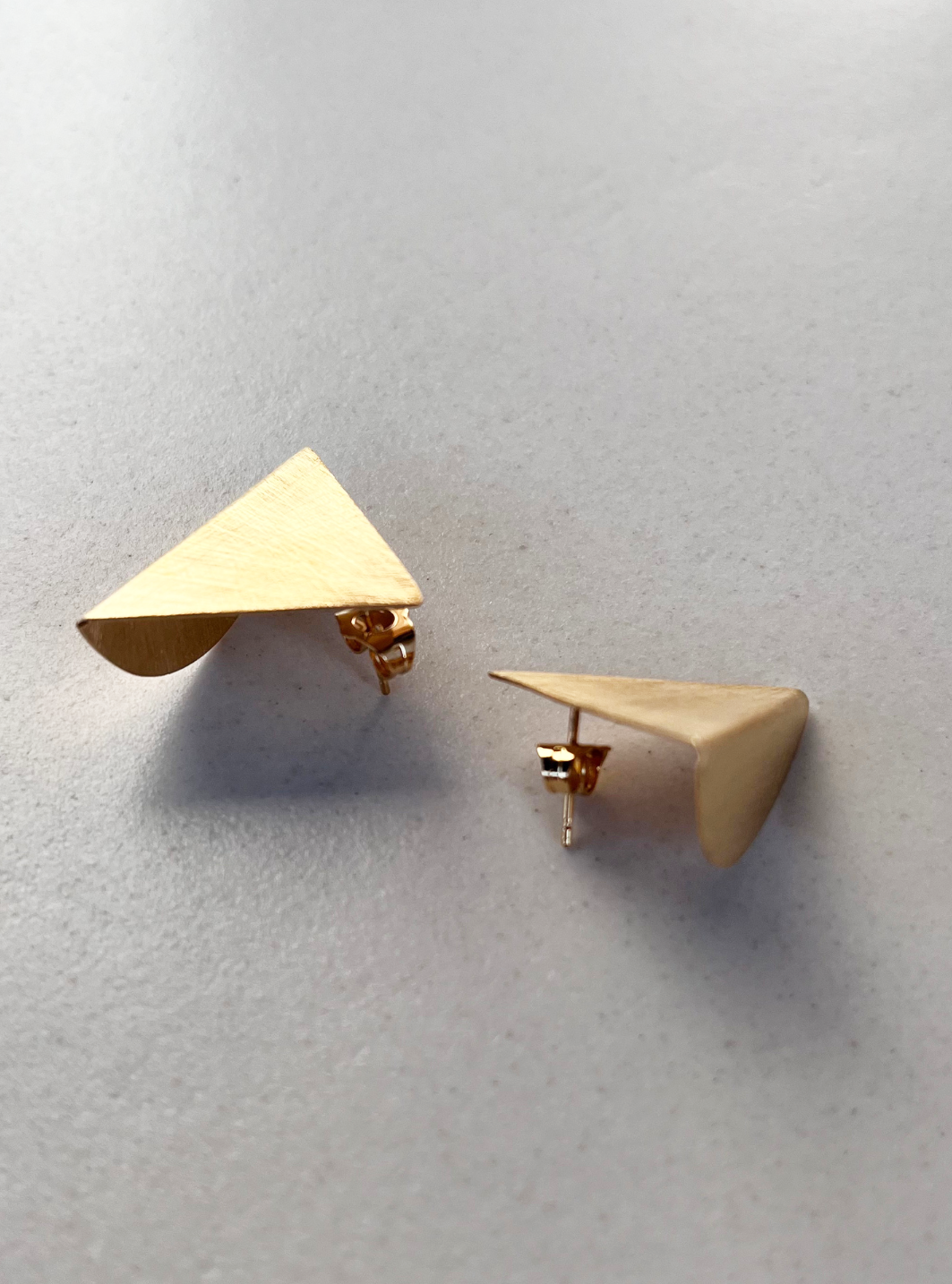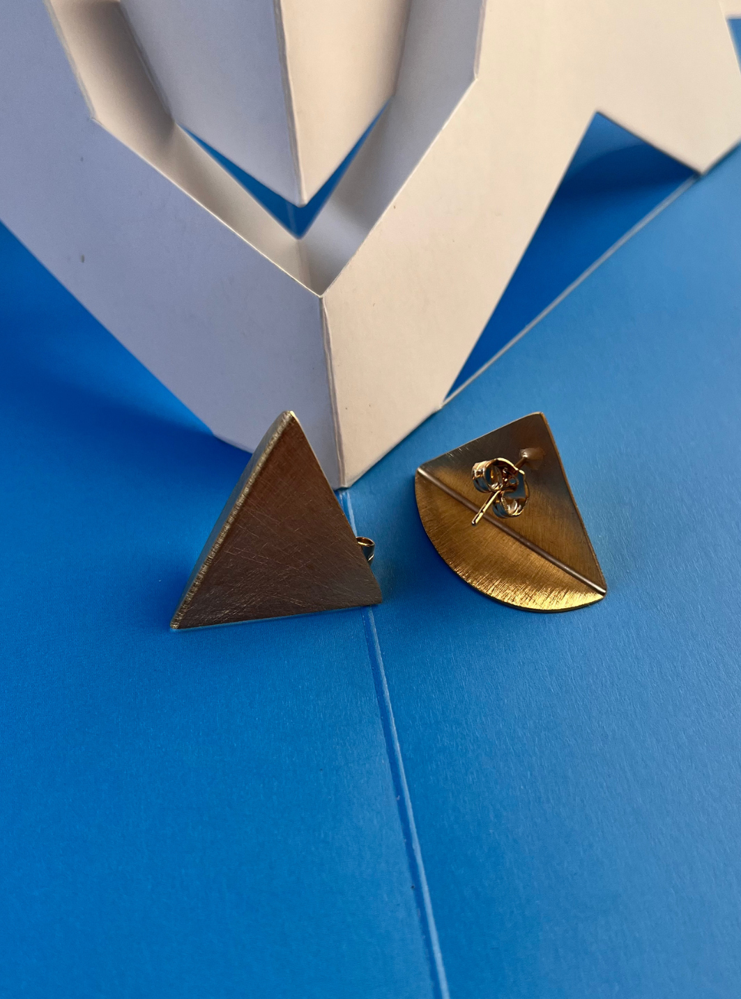 Gli orecchini SIMMETRIA MOMENTANEA sono gioielli artigianali in ottone con rifinitura in oro chiaro satinato in lamina di ottone piegata e lavorata a mano con chiusura a farfallina.