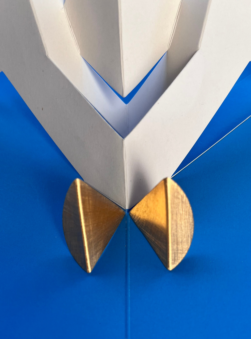 Come nelle sue sperimentazioni con la carta e l’arte degli origami, anche qui il gesto della piega diventa linguaggio visivo: la superficie della lamina si trasforma, generando movimento, volume e leggerezza.
